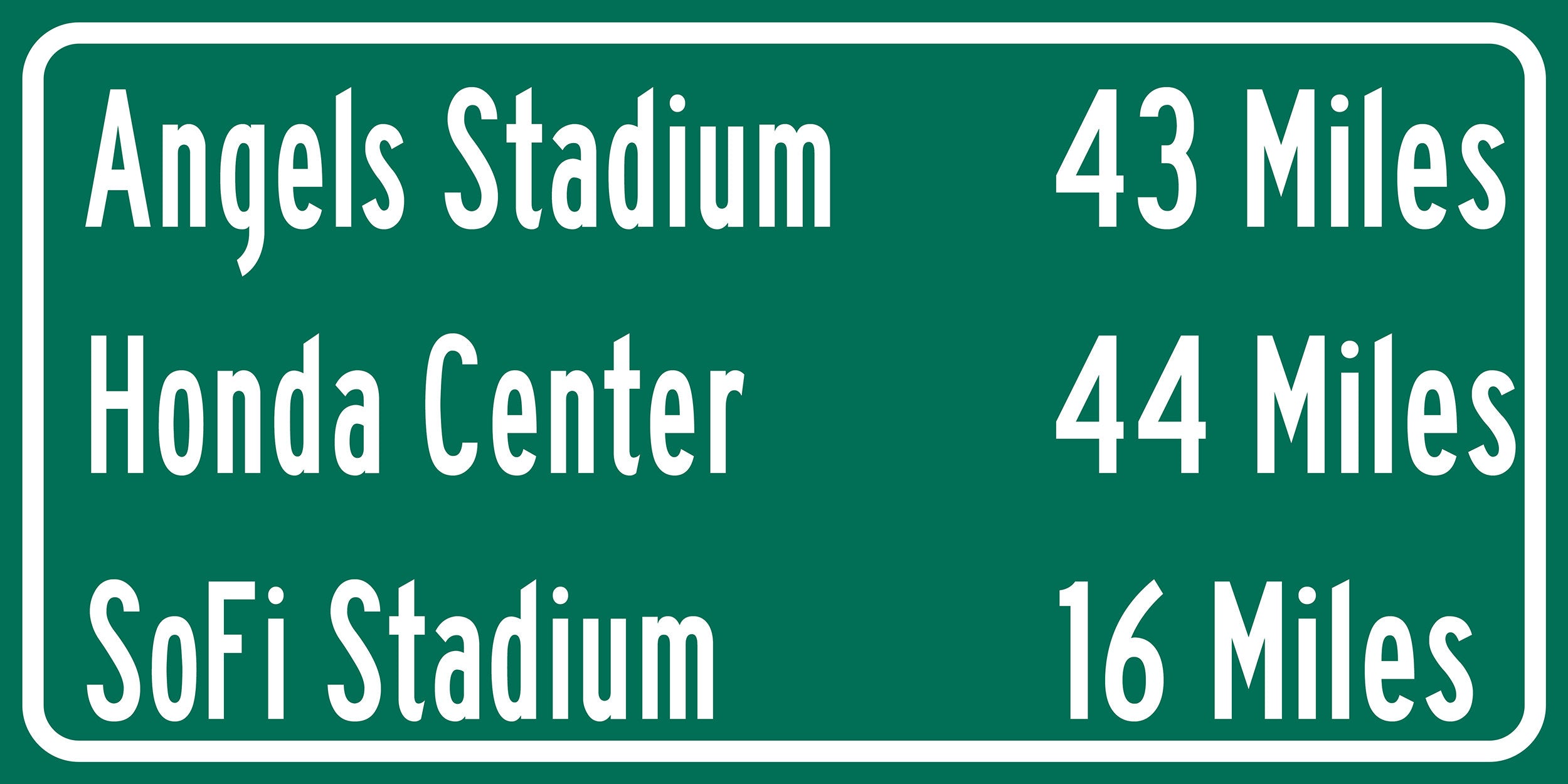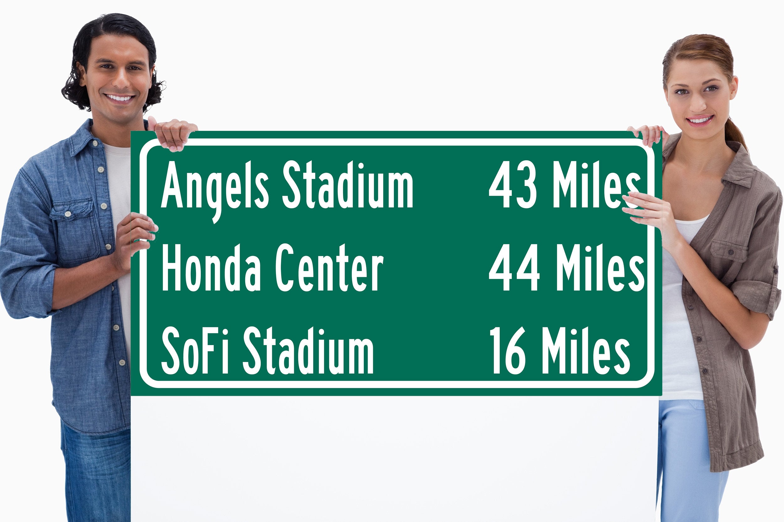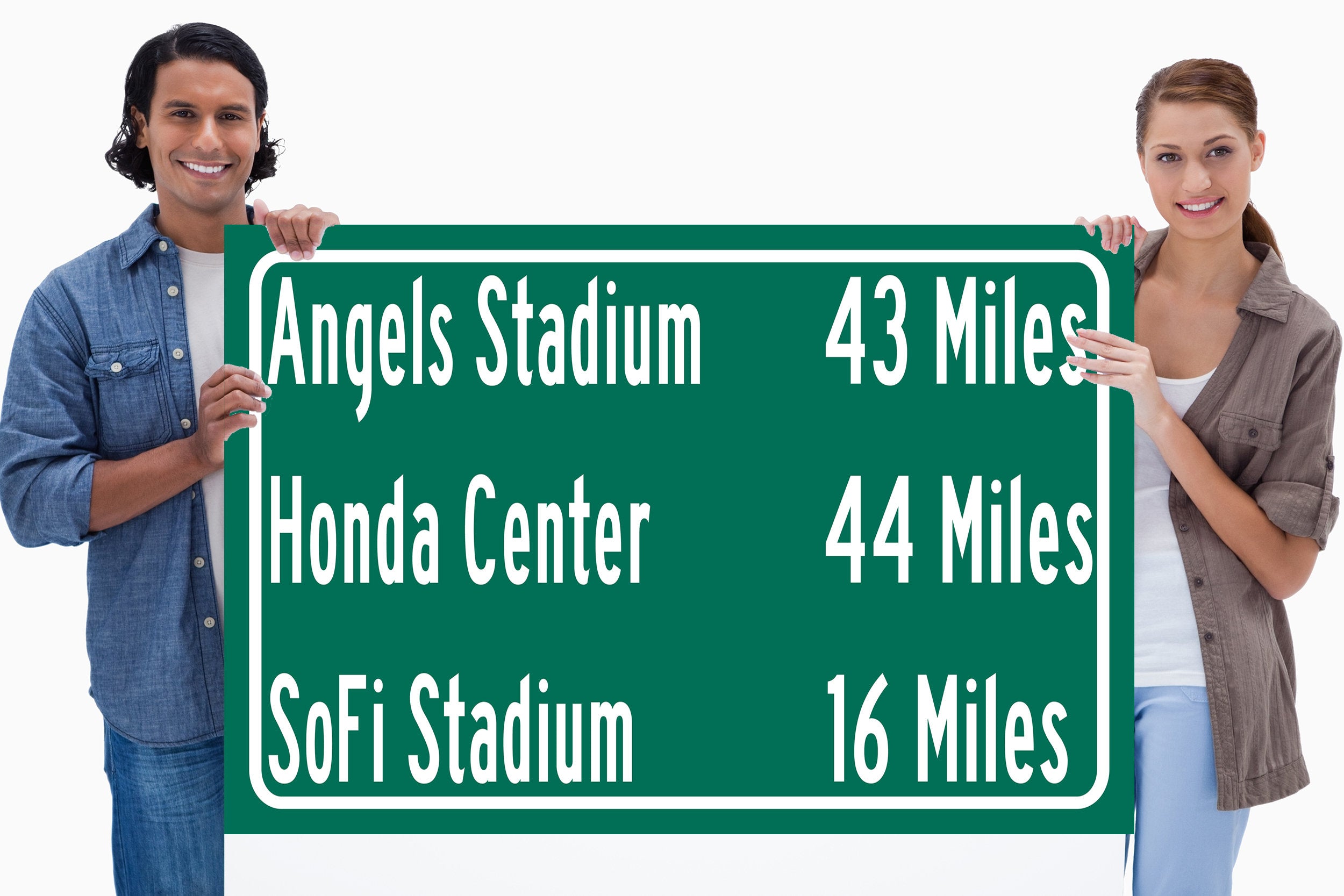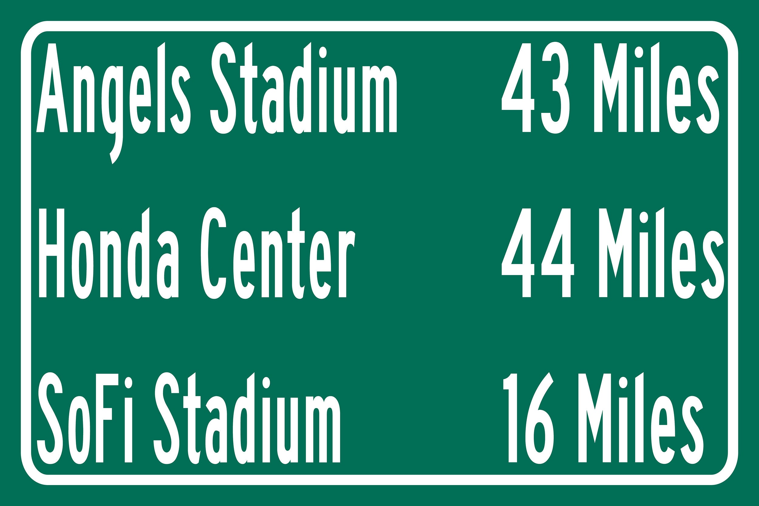 Personalized Highway Distance sign to all the Stadiums, Arenas and Ballparks in Southern California. Custom replica road sign, of the stadium made with real distance from you to the locations. WE GO HUGE!! Not some itty-bitty sign, Our signs are as large as 2 x 3 FEET! Los Angeles Sports Sign, Sofi Stadium, Angel Stadium, Honda Center