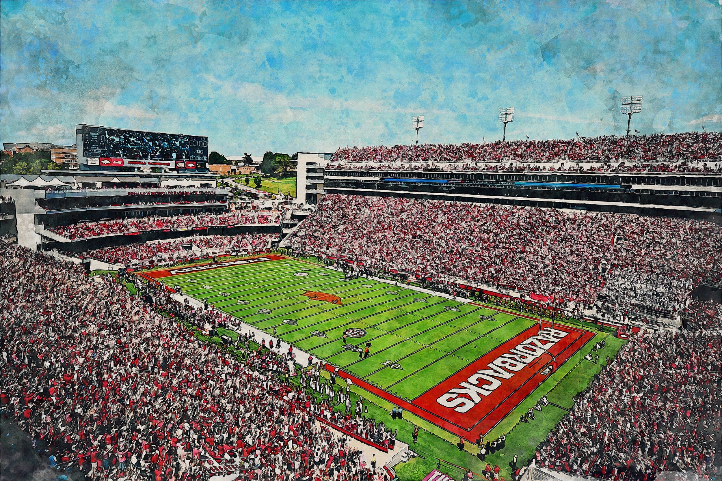 Beautiful Digital watercolor of Donald W. Reynolds Razorback Stadium at University of Arkansas