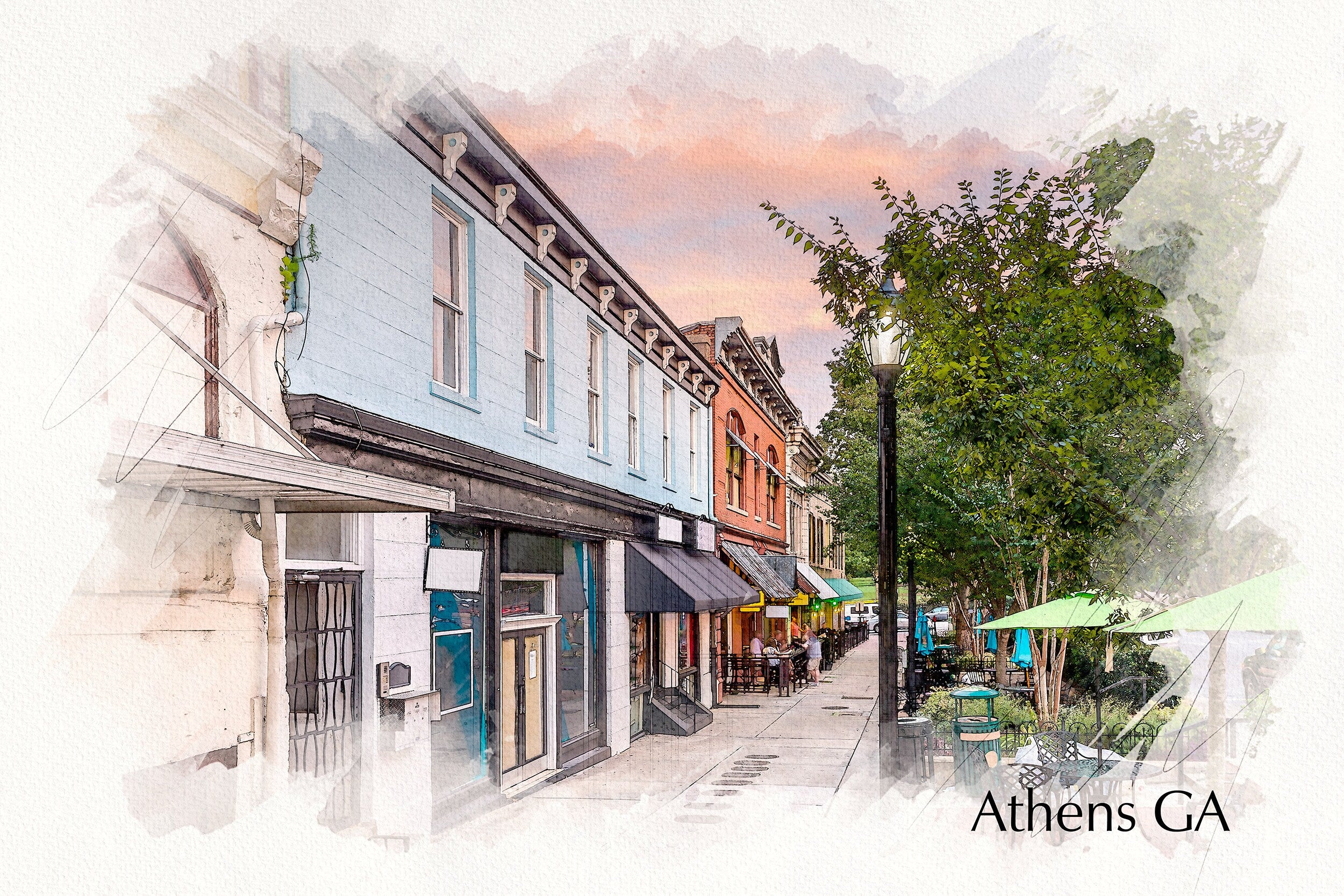 Stunning watercolor of Athens Georgia. Great for a piece of wall art. Available as a single canvas at 16″ x 24″ , 24″ x 36″ , or 32″ x 48″ or we can make you a special 3 panel work of art. University of Georgia. Athens GA wall art