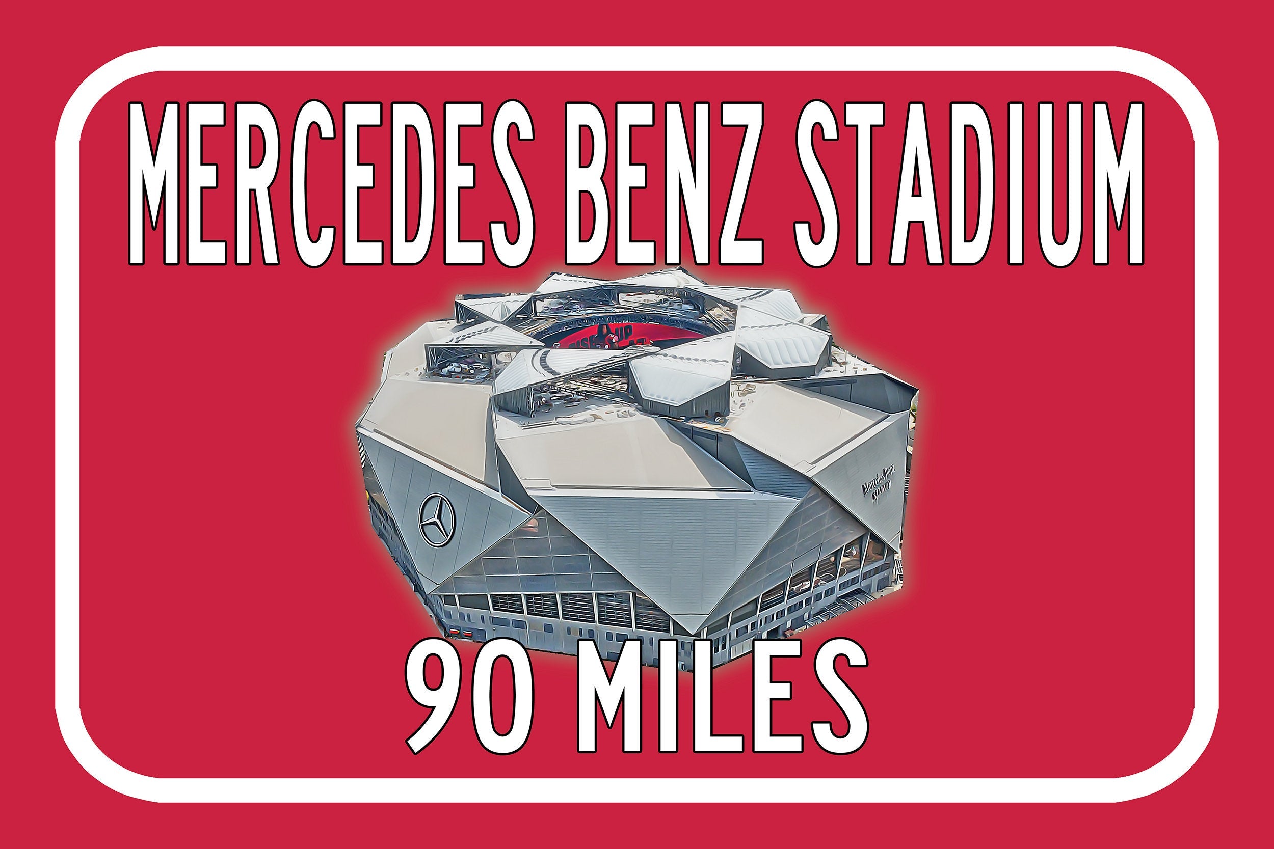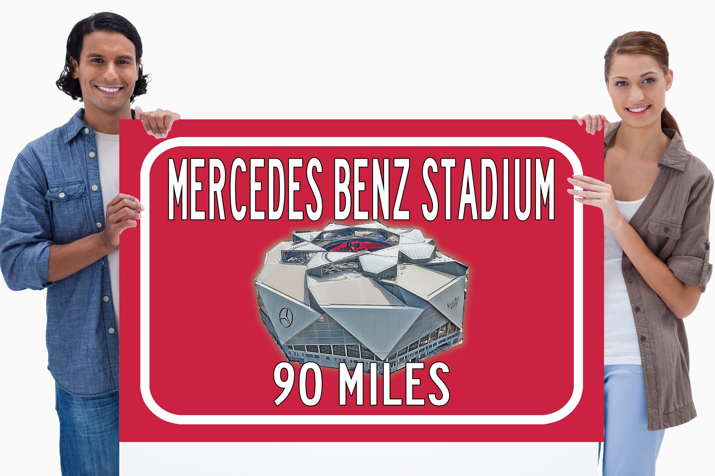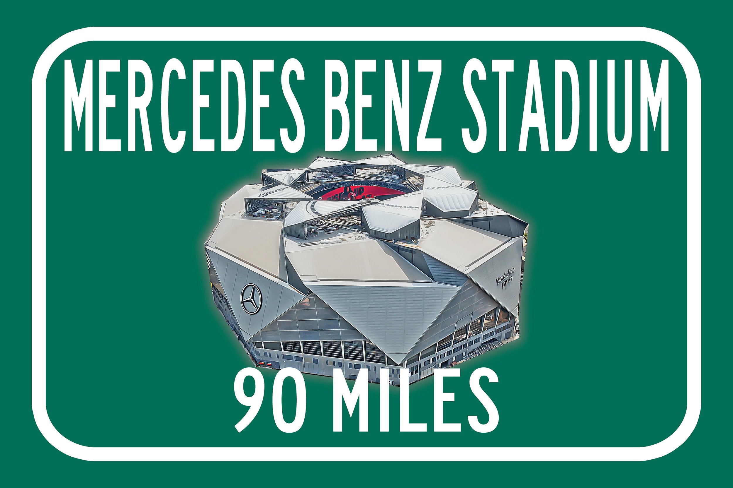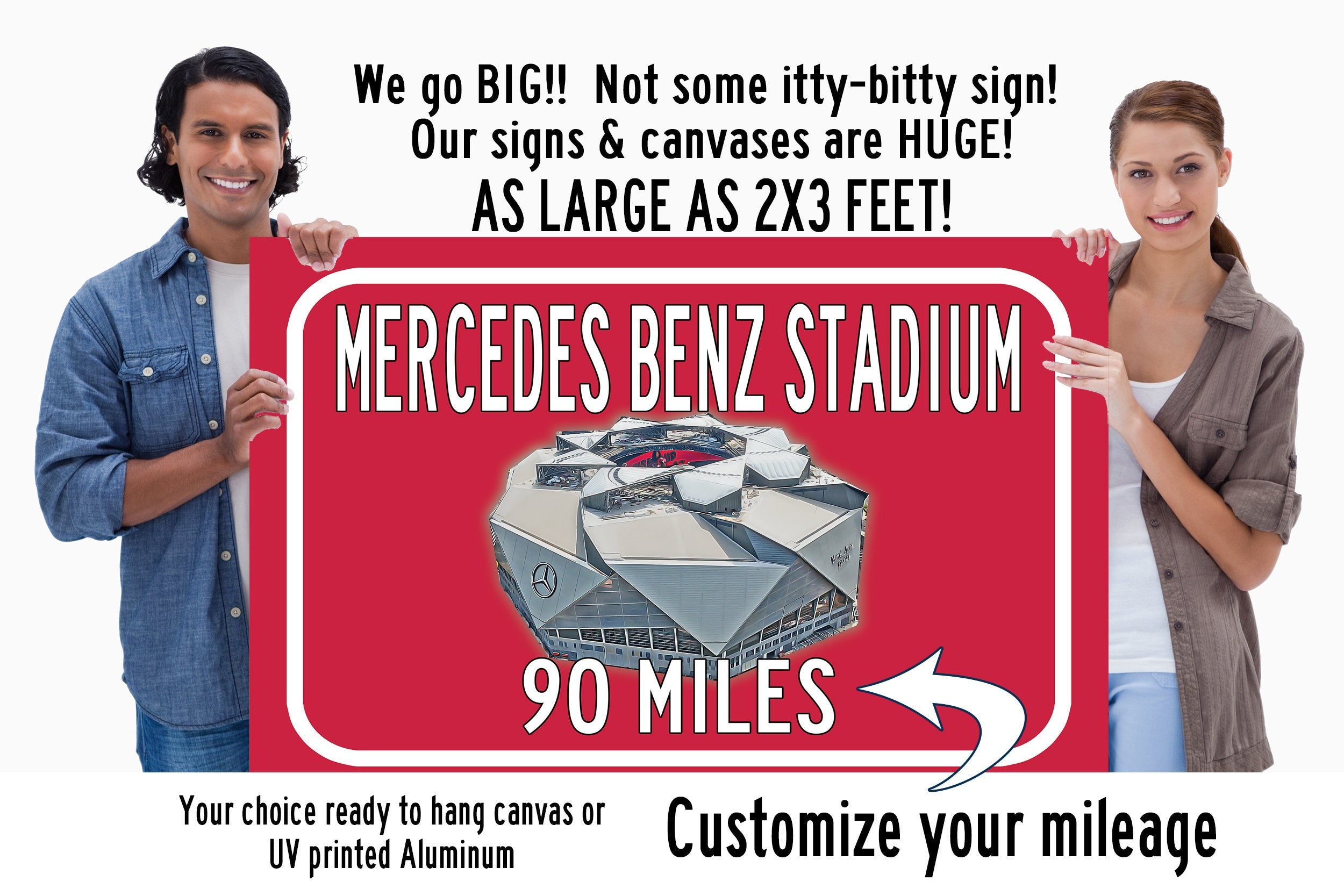 Personalized Highway Distance sign to Mercedes Benz Stadium in Atlanta. Custom replica road sign, with a watercolor photo of the stadium made with real distance from you to Mercedes Benz Stadium. WE GO HUGE!! Not some itty-bitty sign, Our signs are as large as 2 x 3 FEET! Mercedes Benz Stadium highway sign. Atlanta Falcons sign