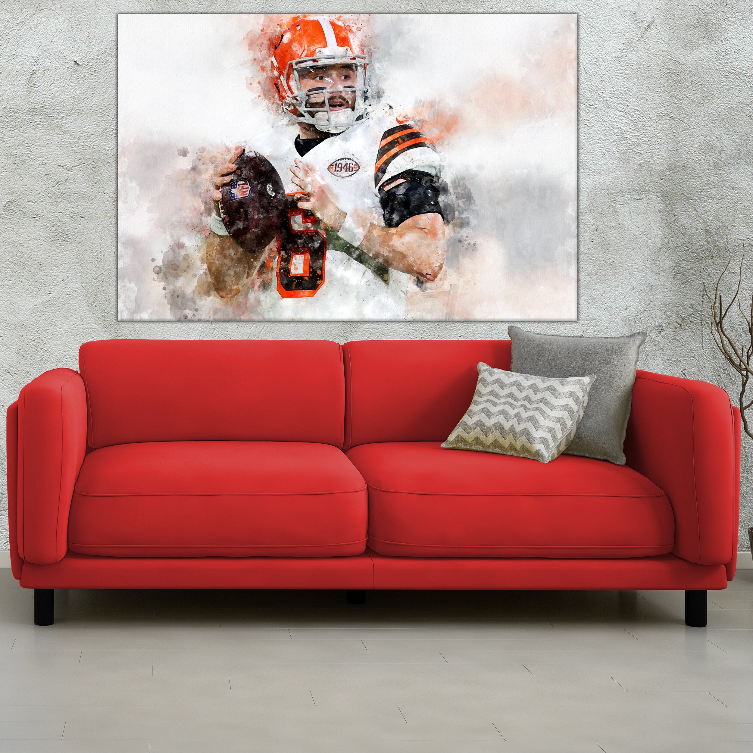 Great for a piece of Baker Mayfield wall art. Available in several sizes as an unframed print or a ready to hang mounted canvas