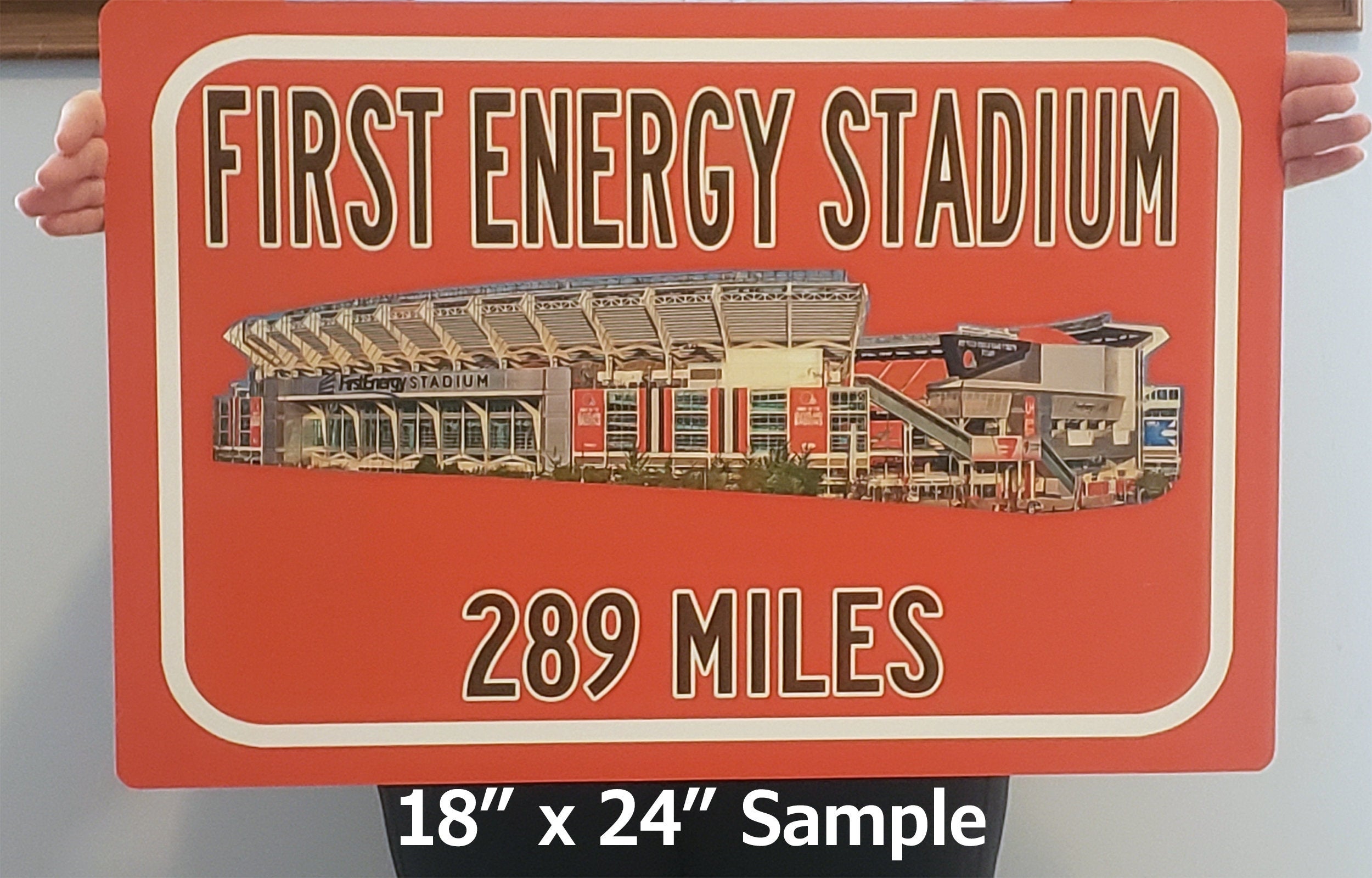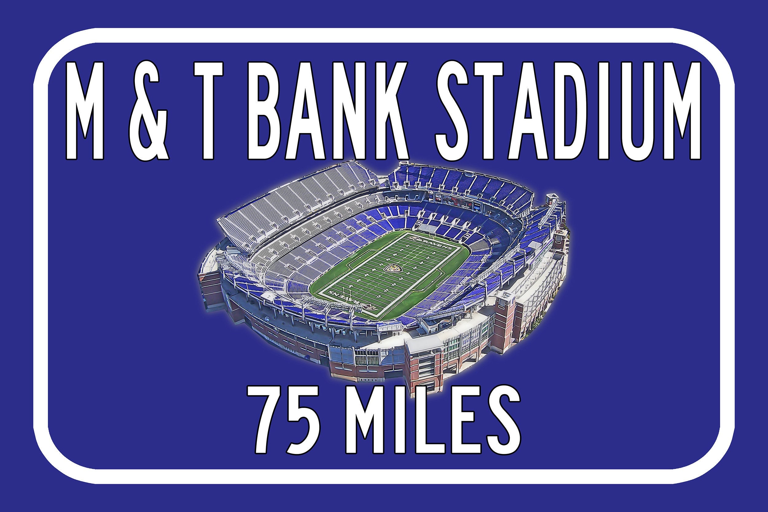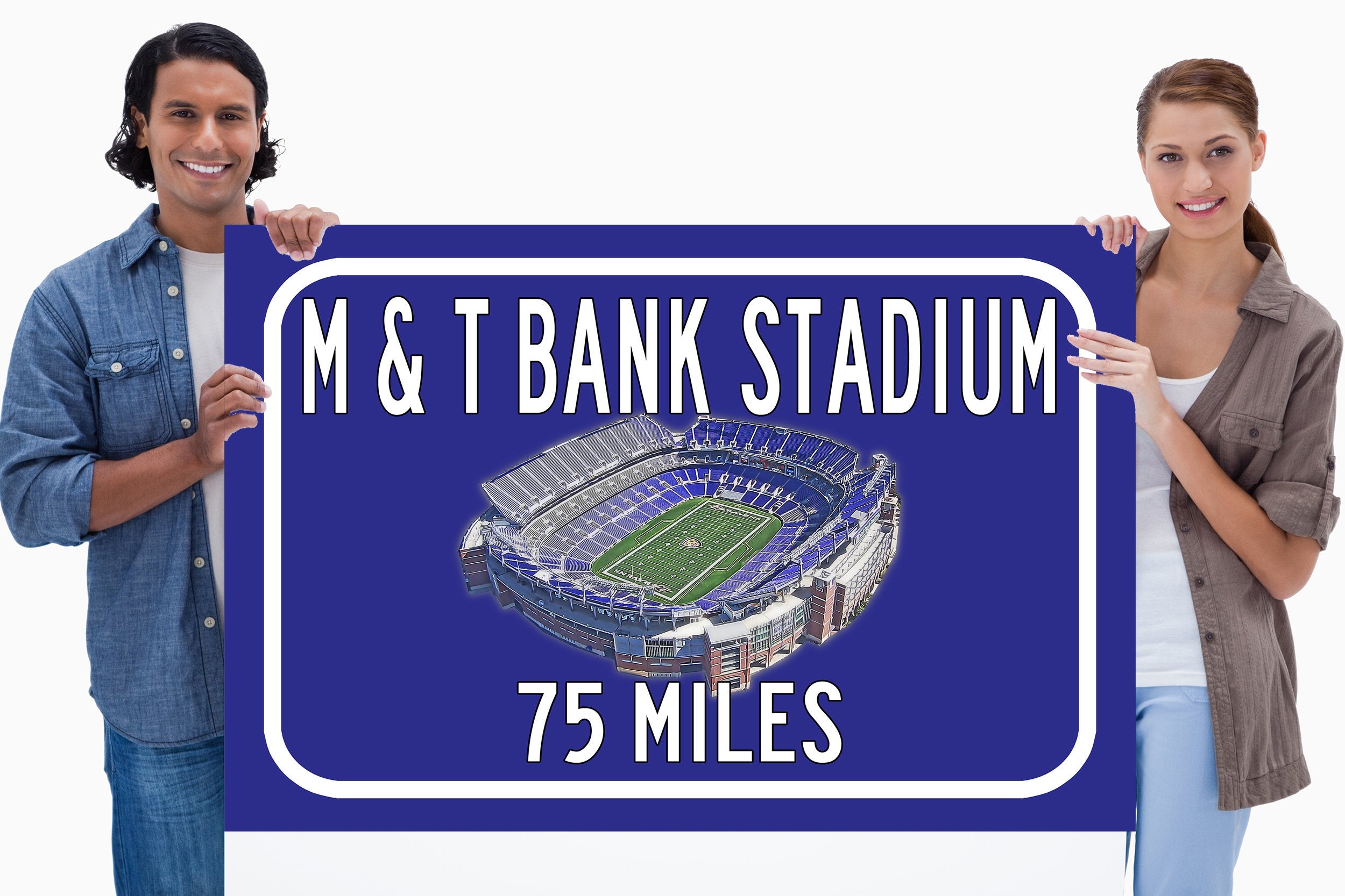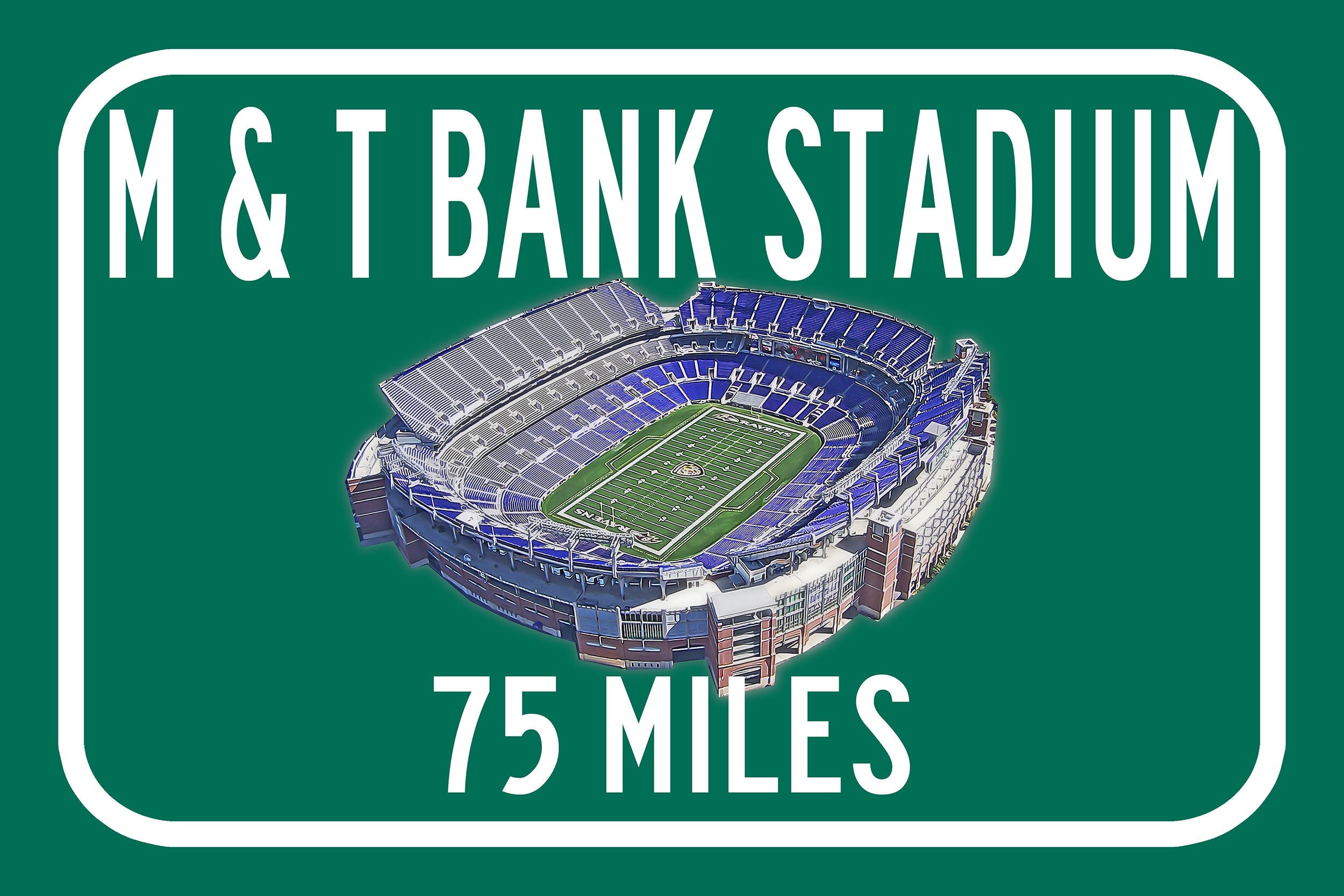 Personalized Highway Distance sign to M&T Bank Stadium in Baltimore. Custom replica road sign, with a watercolor photo of the stadium made with real distance from you to M&T Bank Stadium. WE GO HUGE!! Not some itty-bitty sign, Our signs are as large as 2 x 3 FEET! M&T Bank Stadium highway sign. Baltimore Ravens sign