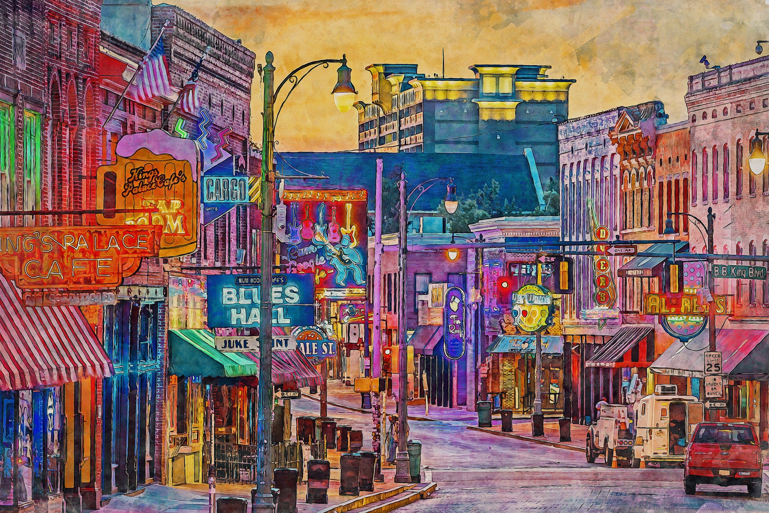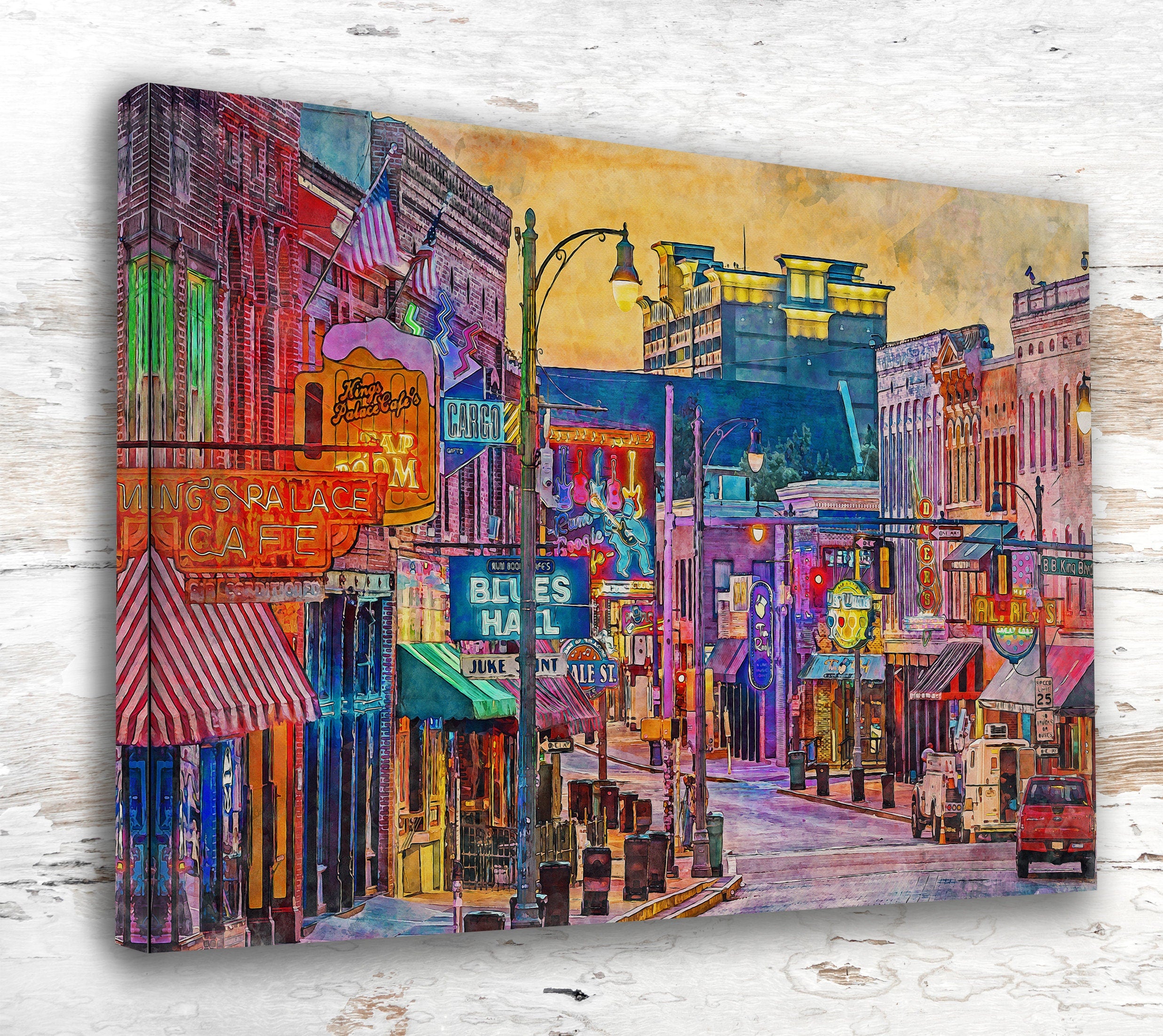 Beale Street in Memphis Tennessee watercolor canvas, Memphis Tennessee canvas watercolor print. This lovely piece of digitally created Beale Street Tennessee wall art is perfect for any room in your home. Memphis Tennessee is one of the most beautiful cities in the country.