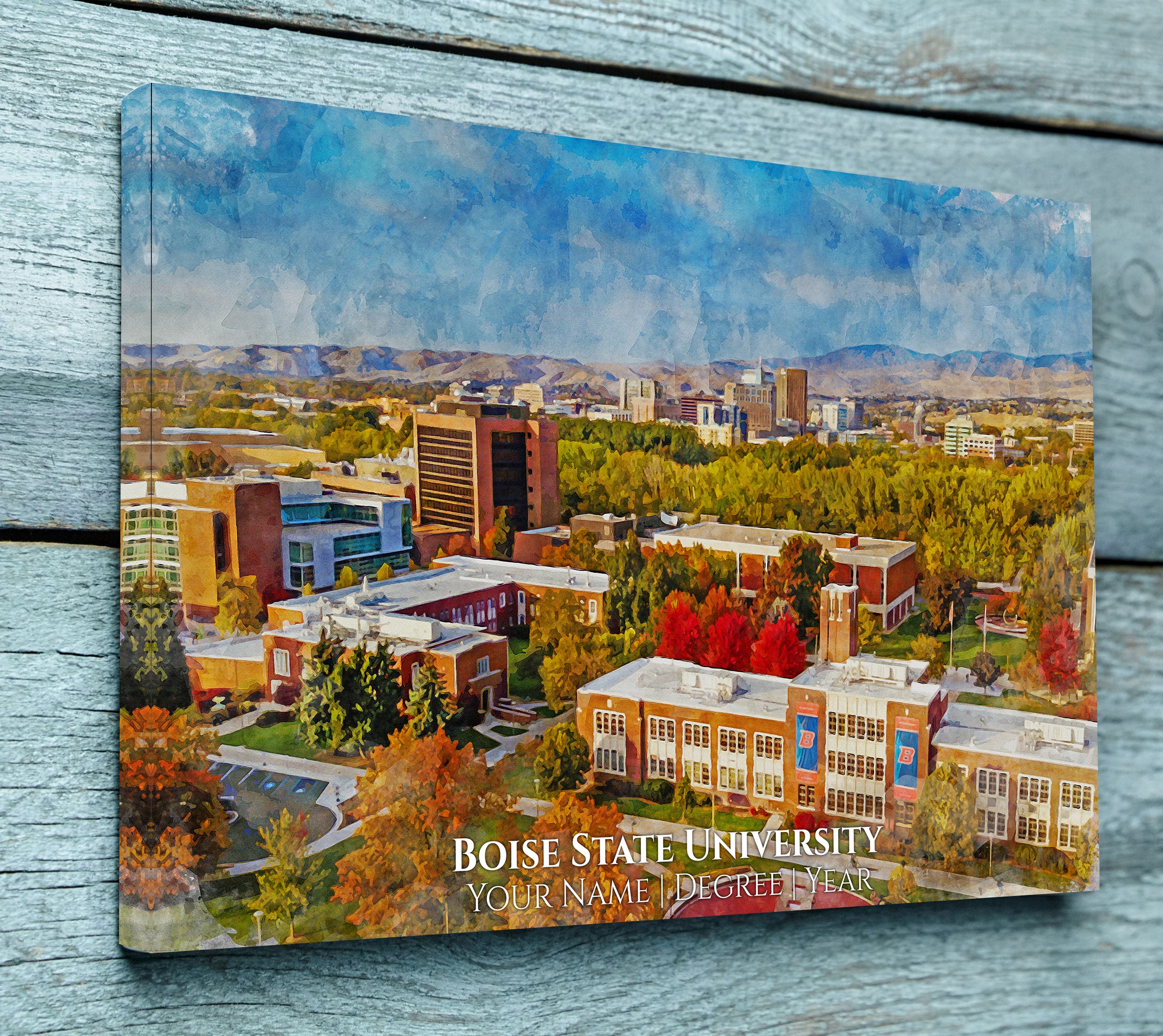You will love these watercolor canvas fine art prints of Boise State University. Perfect for a graduation gift. These make wonderful gift for Boise State University Alumni and fans. Feel free to customize it as well when you check out. We will send a proof for you to approve before we print so please check your email about 24hrs after you order