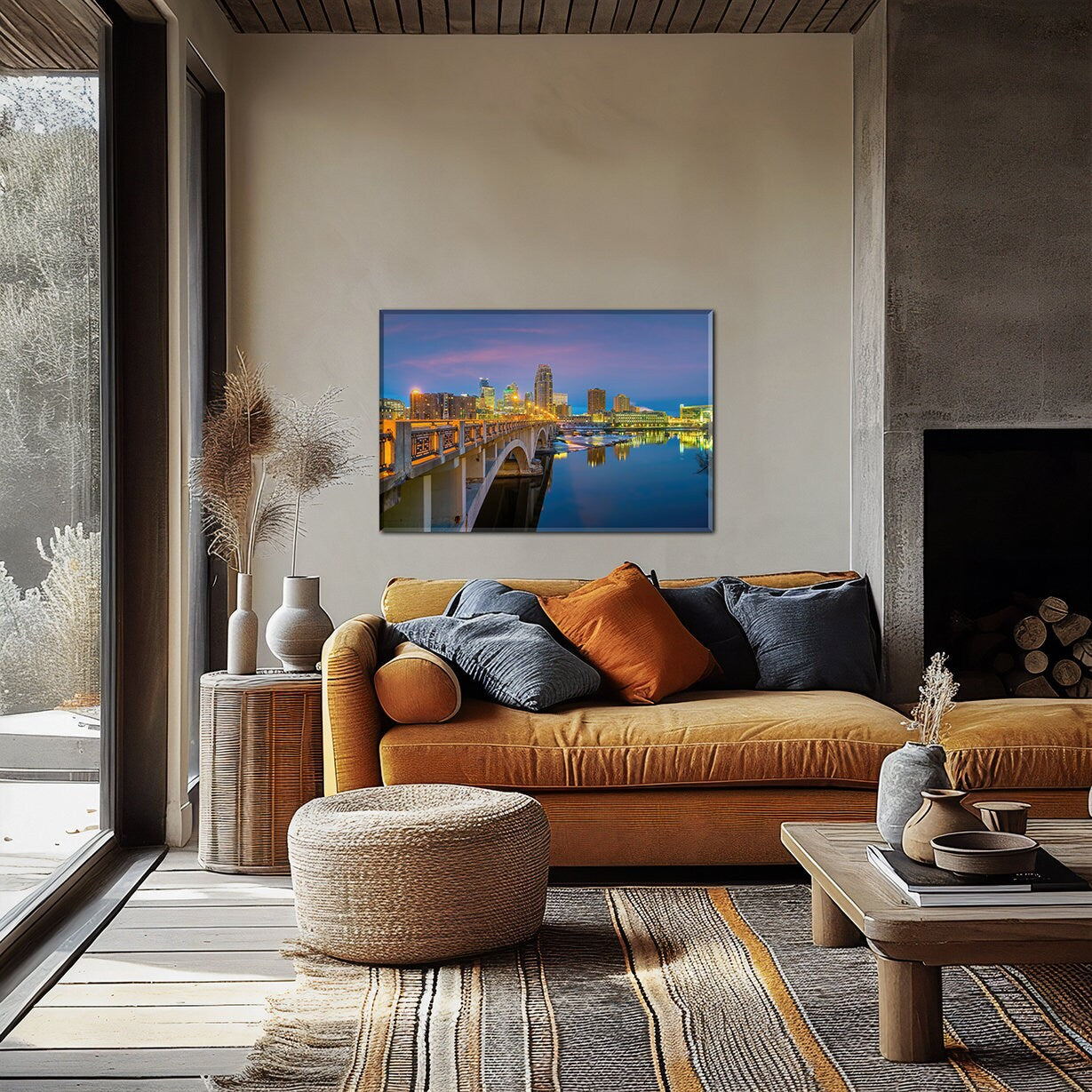 Transform your space with our custom printed canvas featuring the beautiful Minneapolis skyline. This fine art print captures the essence of one of the twin cities, with its colorful skyline overlooking the river.