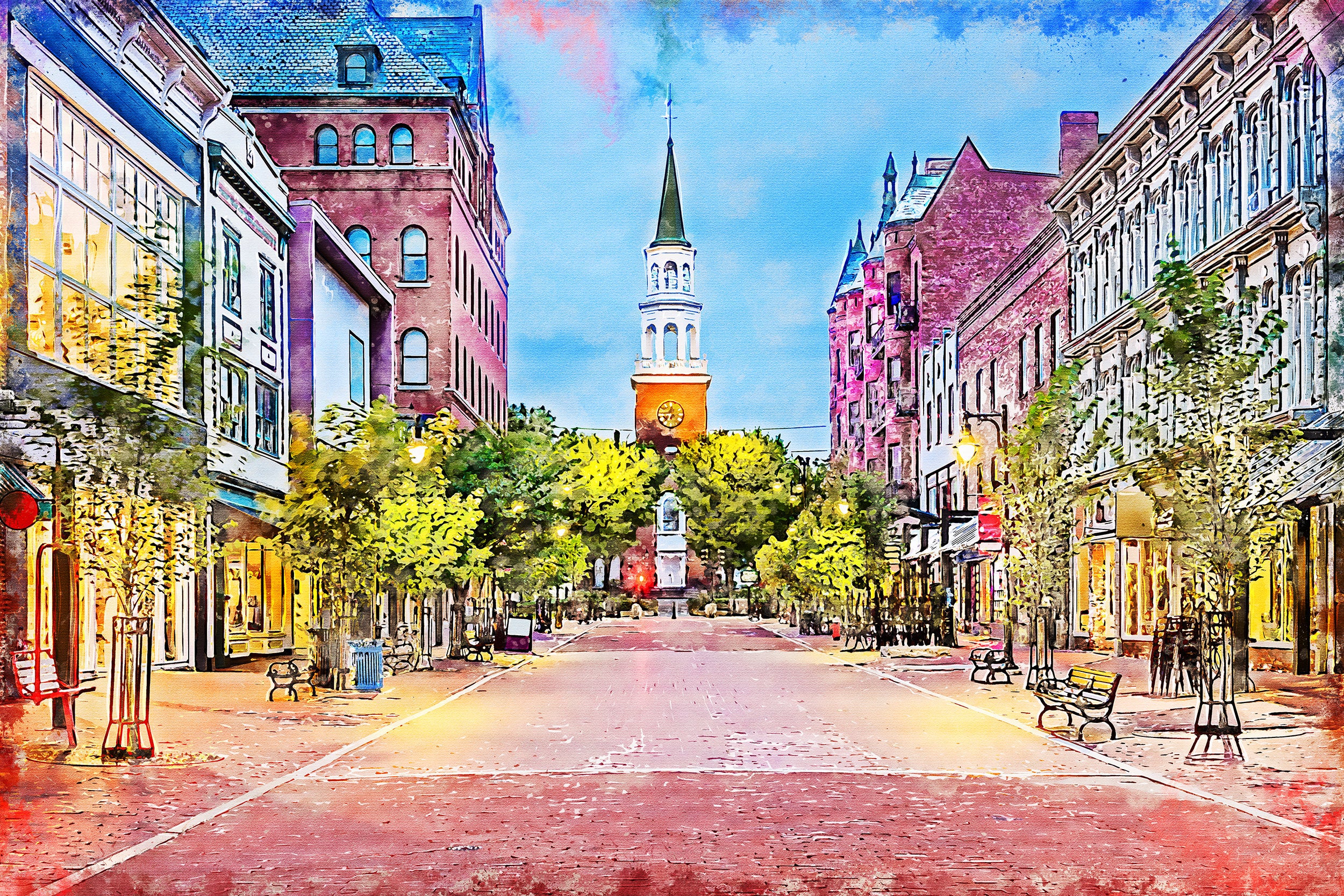 Lovely Street watercolor in Burlington Vermont on canvas framed and ready to hang. Stunning colors that make for the perfect wall decor. Burlington Vermont canvas