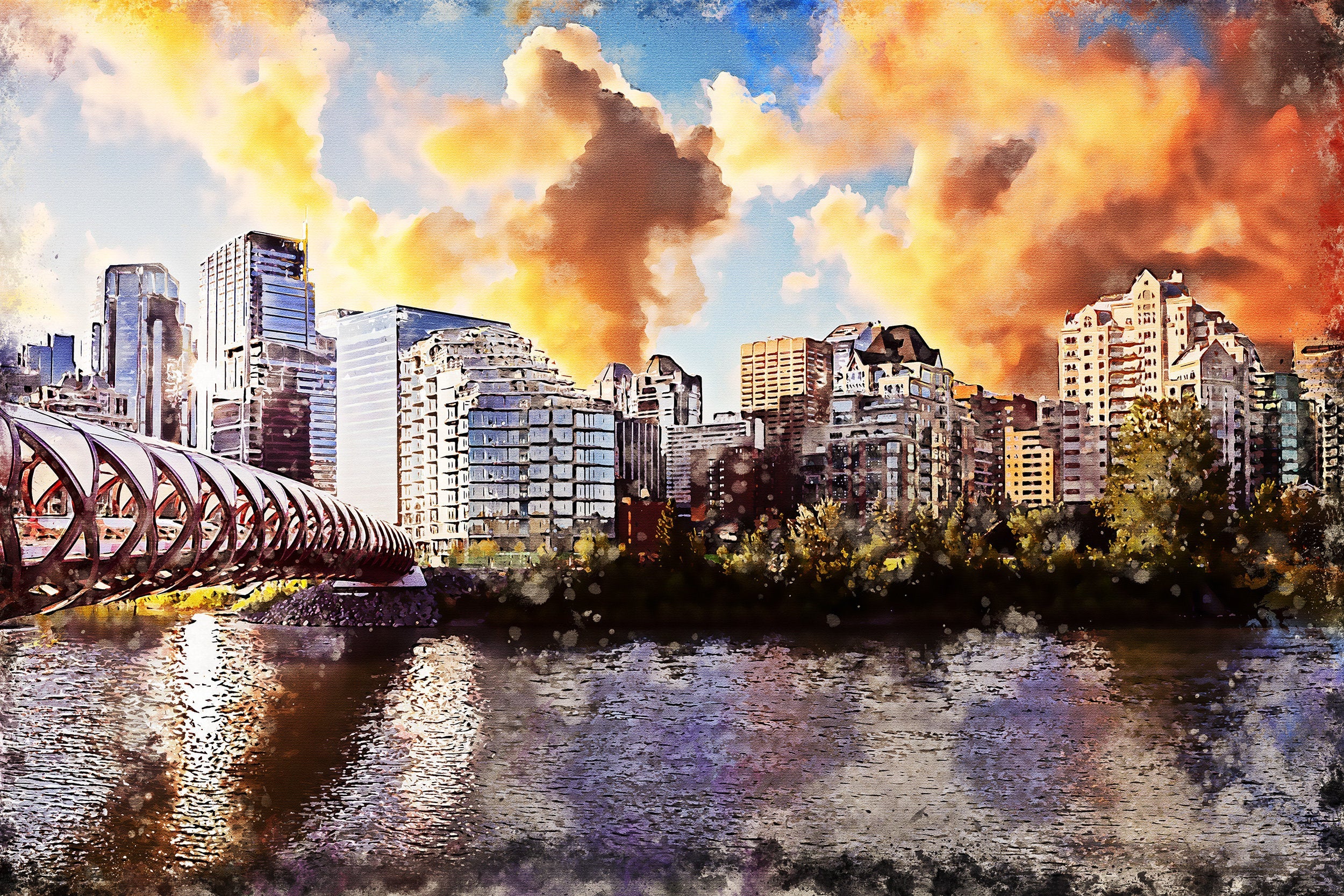 Calgary watercolor skyline canvas, Peace Bridge Canada Canvas, Calgary watercolor canvas, Calgary Canada wall art, Canada skyline wall art,