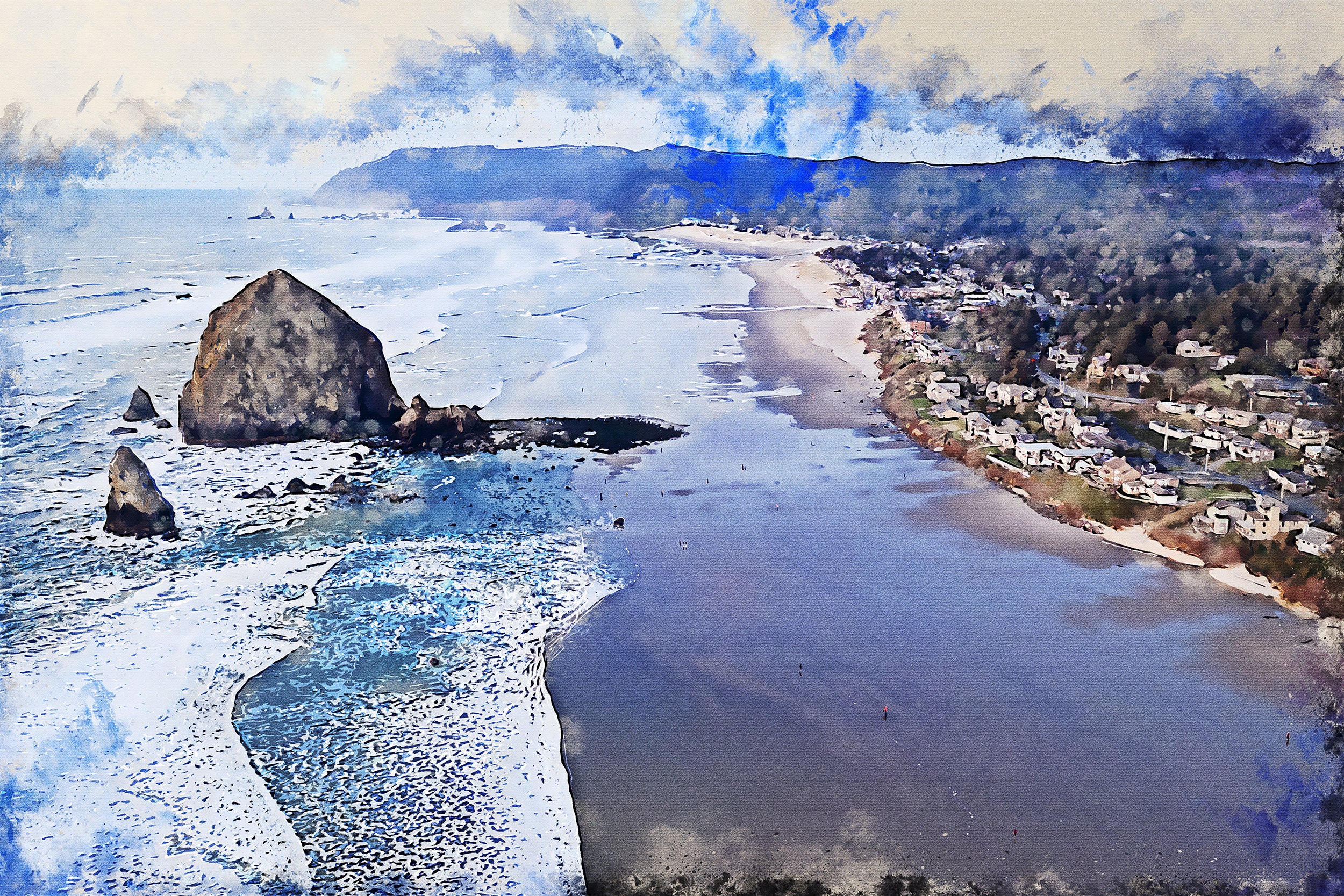 The beautiful city of on canvas Cannon beach Oregon watercolor and ready to hang. Stunning colors that make for the perfect wall decor. Cannon Beach Oregon canvas watercolor