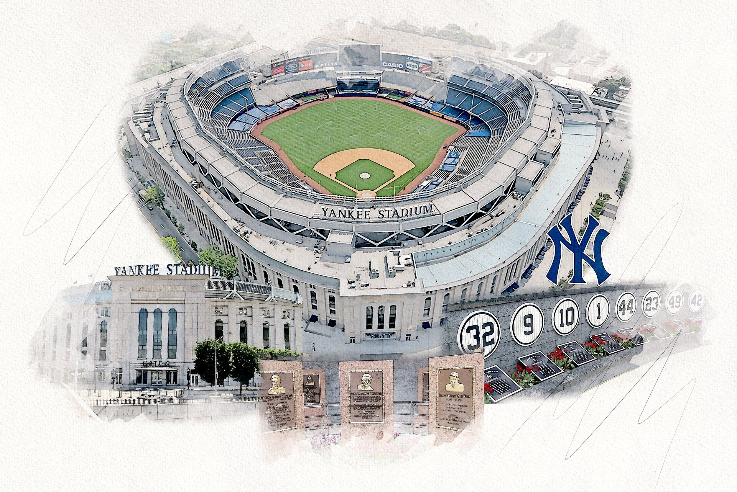 Beautiful print of the Yankee Stadium which Includes some images from monument park as well