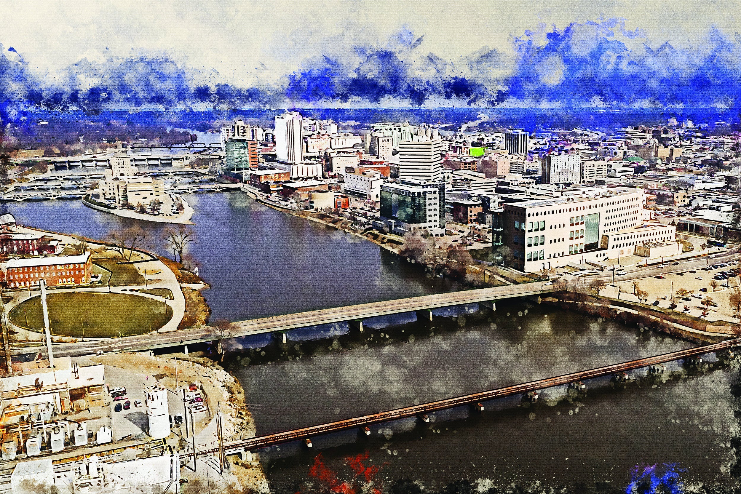 The beautiful watercolor of Cedar Rapids Iowa on canvas framed and ready to hang. Stunning colors that make for the perfect wall decor. Cedar Rapids watercplor