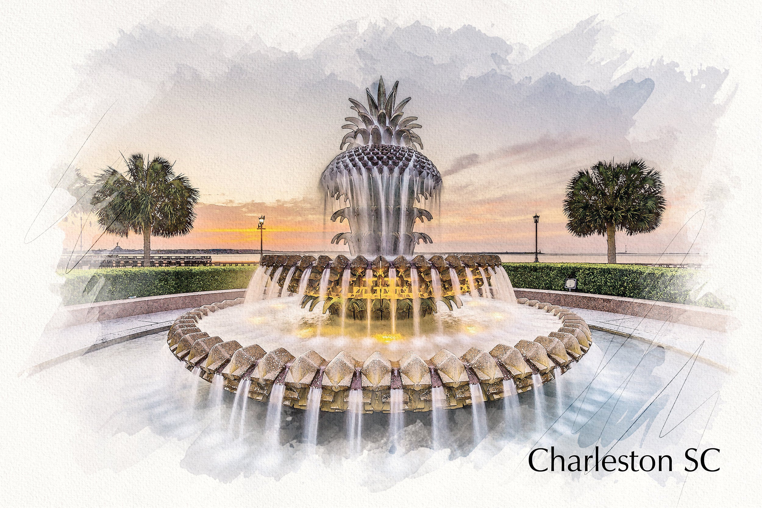 Stunning sketch watercolor on canvas of the Charleston Pineapple fountain. Great for a piece of wall art. Available as a single canvas at 16″ x 24″ , 24″ x 36″ , or 32″ x 48″ or we can make you a special 3 panel work of art or get the digital file and you can print it yourself. ( Digital File only, no product included)