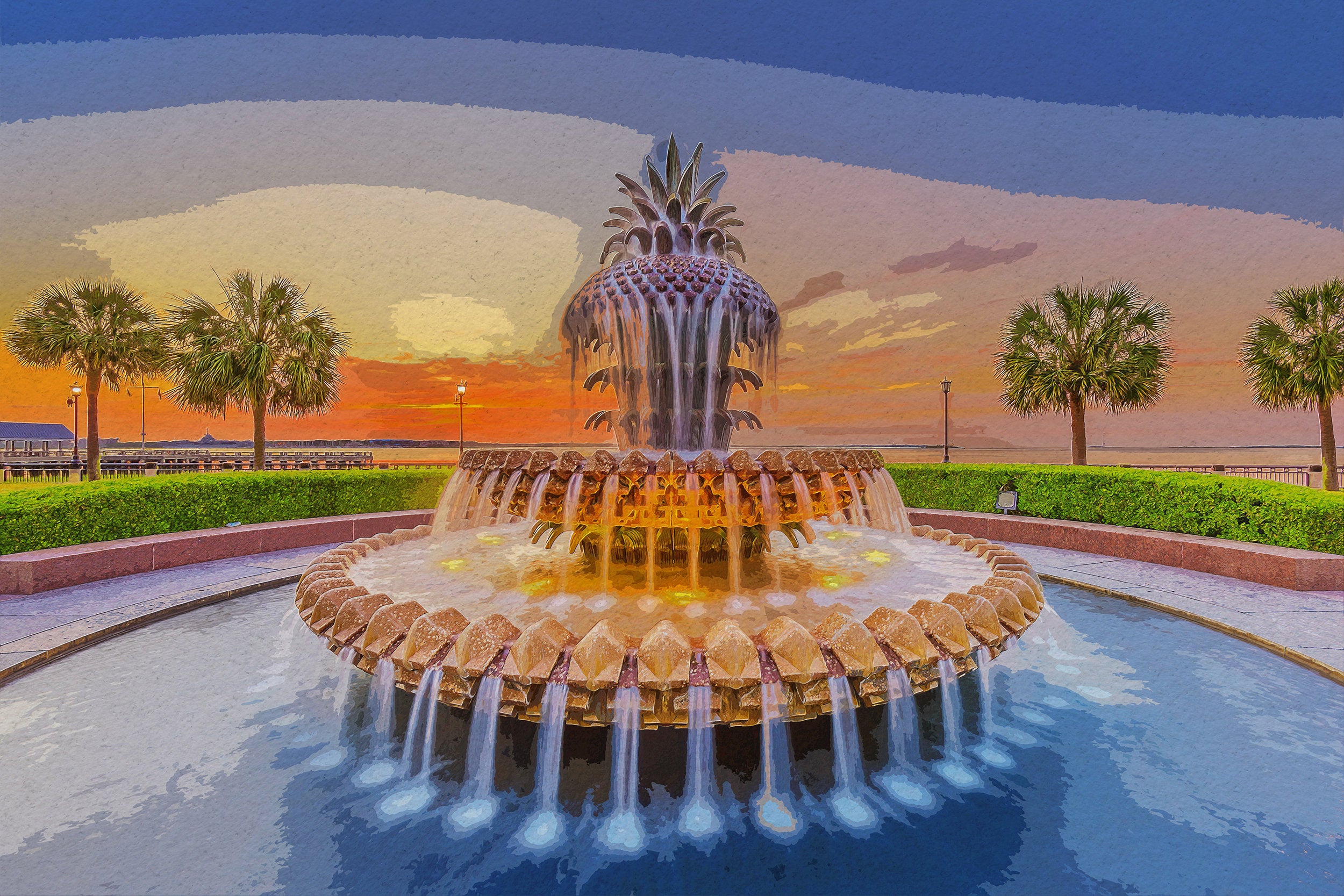 Stunning watercolor on canvas of the Charleston Pineapple fountain. Great for a piece of wall art. Available as a single canvas at 16″ x 24″ , 24″ x 36″ , or 32″ x 48″ or we can make you a special 3 panel work of art as large as 4 x 8 foot wide or get the digital file and you can print it yourself. ( Digital File only, no product included)