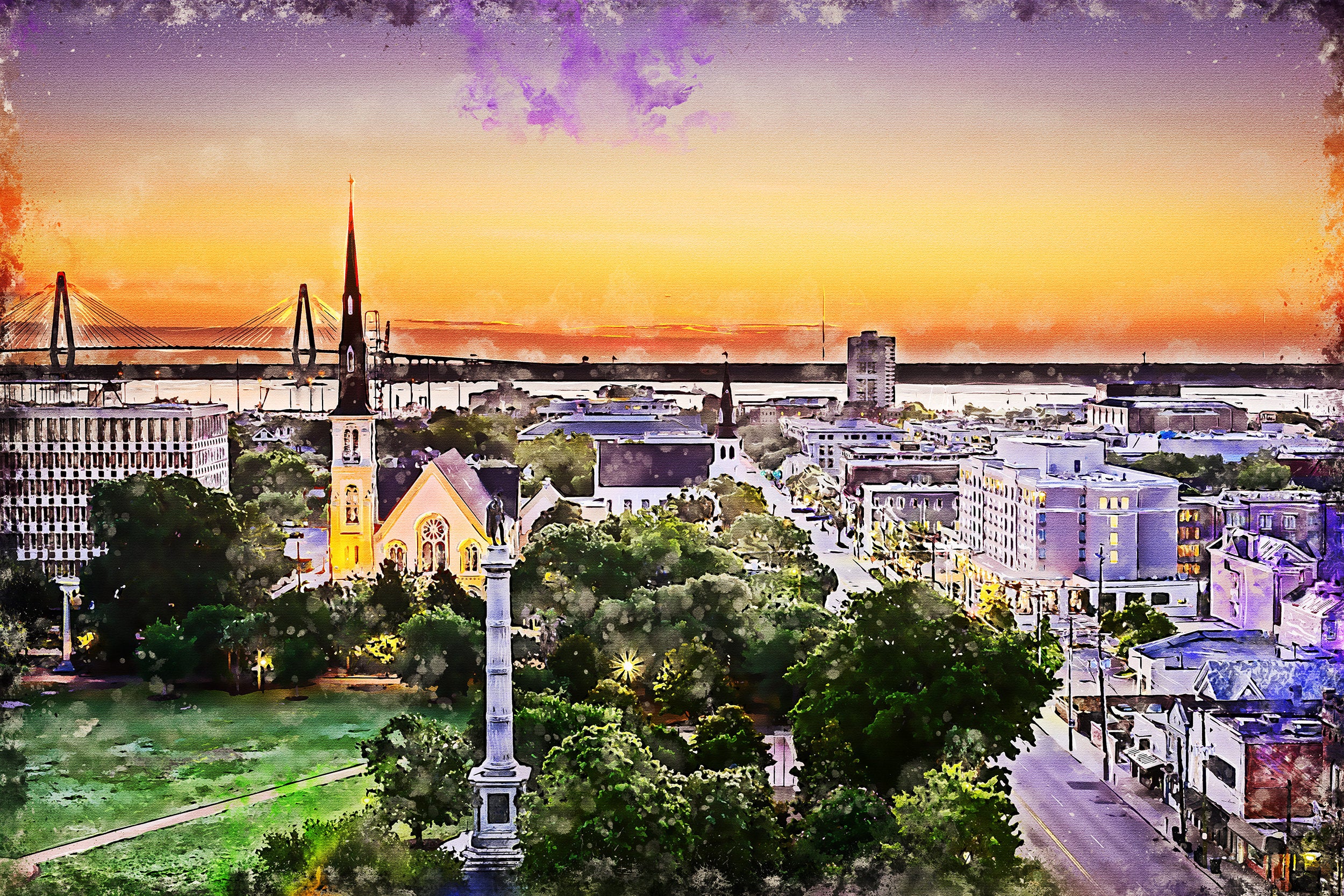 Charleston South Carolina watercolor on Canvas. Charleston Print Great for a piece of wall art. Available as a single canvas at 16″ x 24″ , 24″ x 36″ , or 32″ x 48″ or we can make you a special 3 panel work of art as large as 4 x 8 foot wide. Charleston Marion Square watercolor