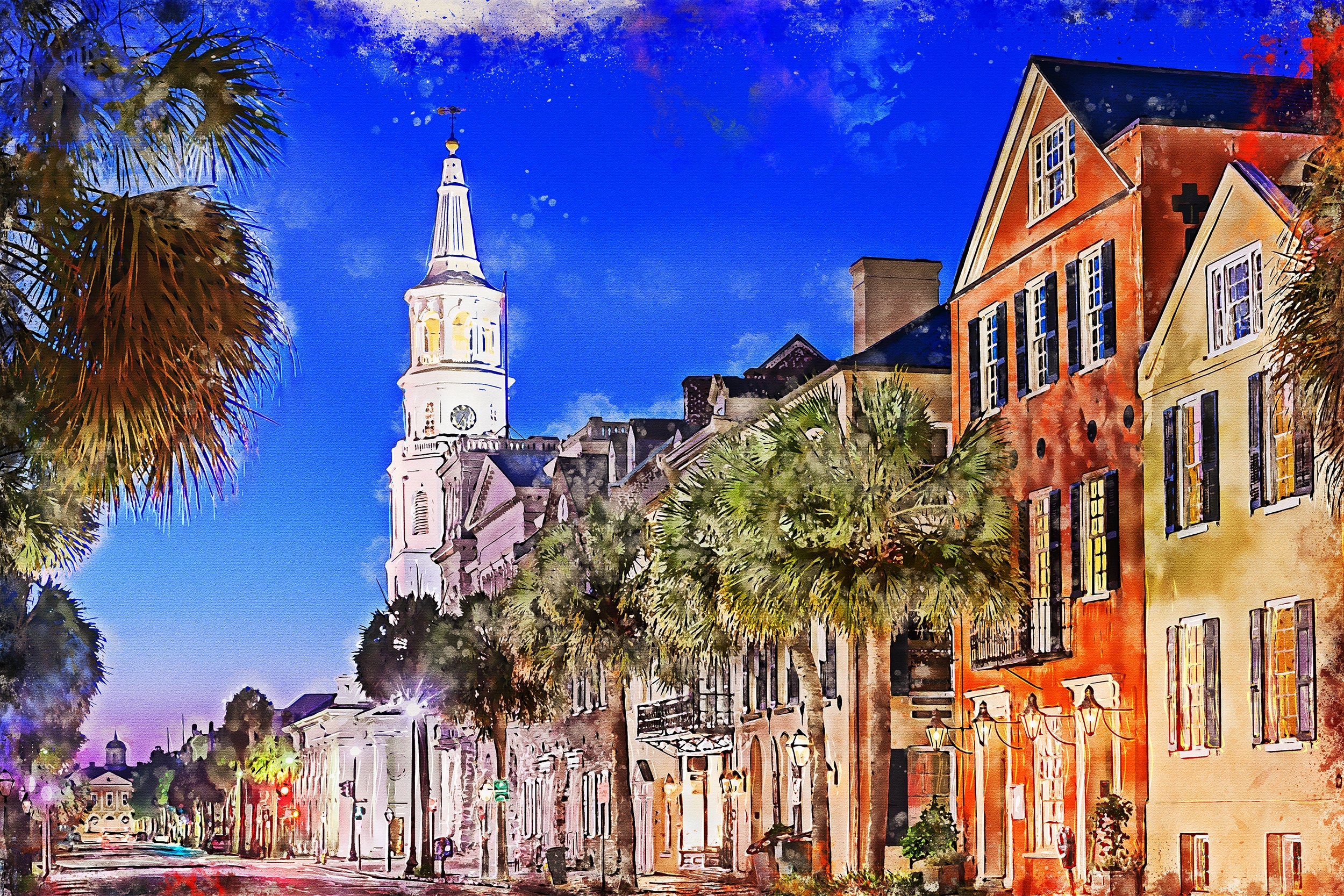 Stunning steet watercolor in Charleston South Carolina. Charleston watercolor canvas. Great for a piece of wall art. Available as a single canvas at 16″ x 24″ , 24″ x 36″ , or 32″ x 48 or a beautiful 3 panel set that is 4.5 feet x 3 feet or if you prefer, a digital download and you can print it your self. (no physical product sent) Charleston art