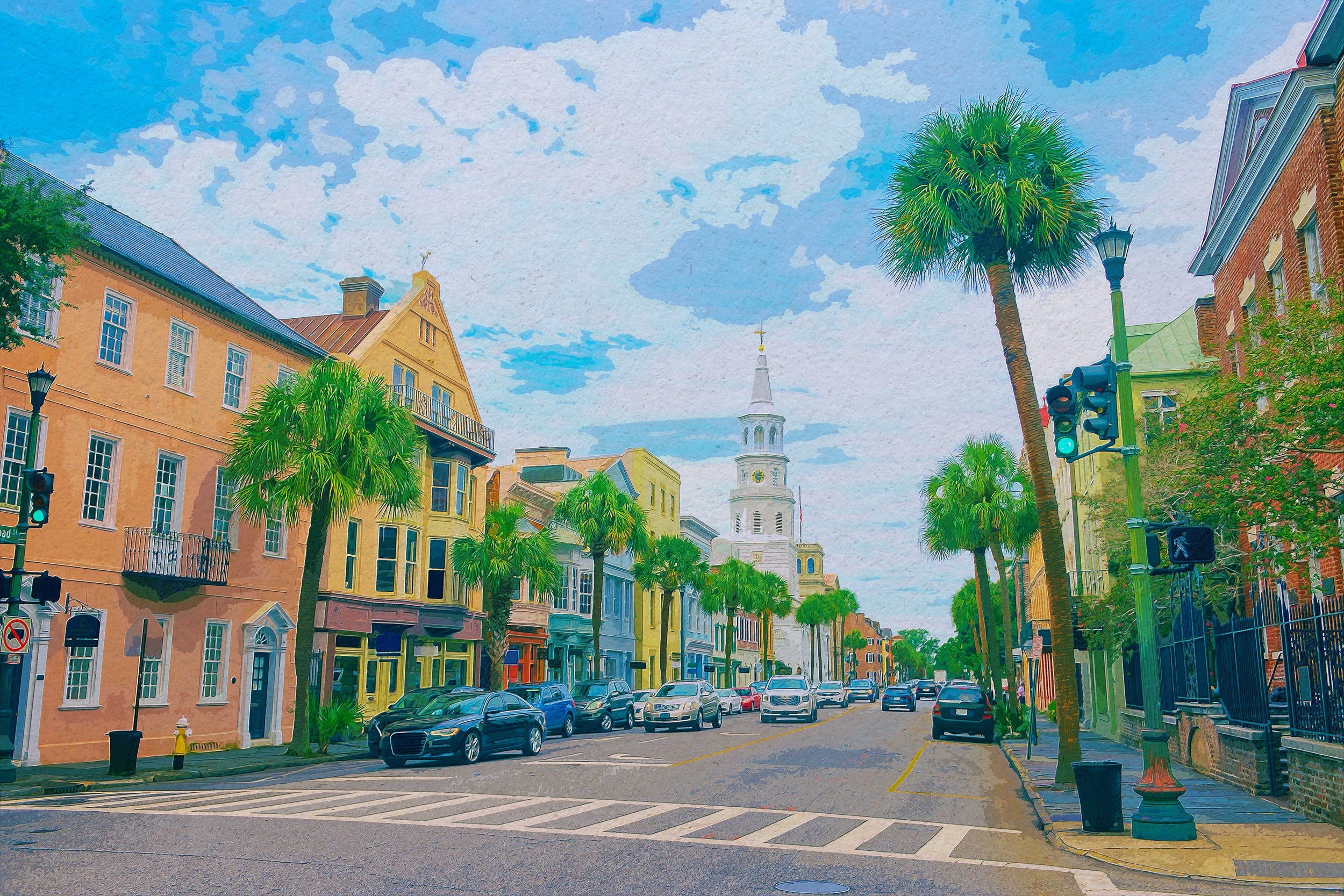 Stunning steet watercolor in Charleston South Carolina. Charleston canvas. Great for a piece of wall art. Available as a single canvas at 16″ x 24″ , 24″ x 36″ , or 32″ x 48 or a beautiful 3 panel set that is 4.5 feet x 3 feet or if you prefer, a digital download and you can print it your self. (no physical product sent) Charleston watercolor