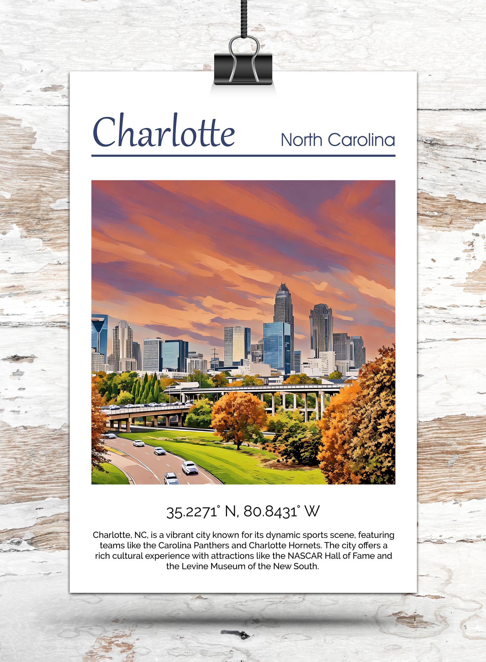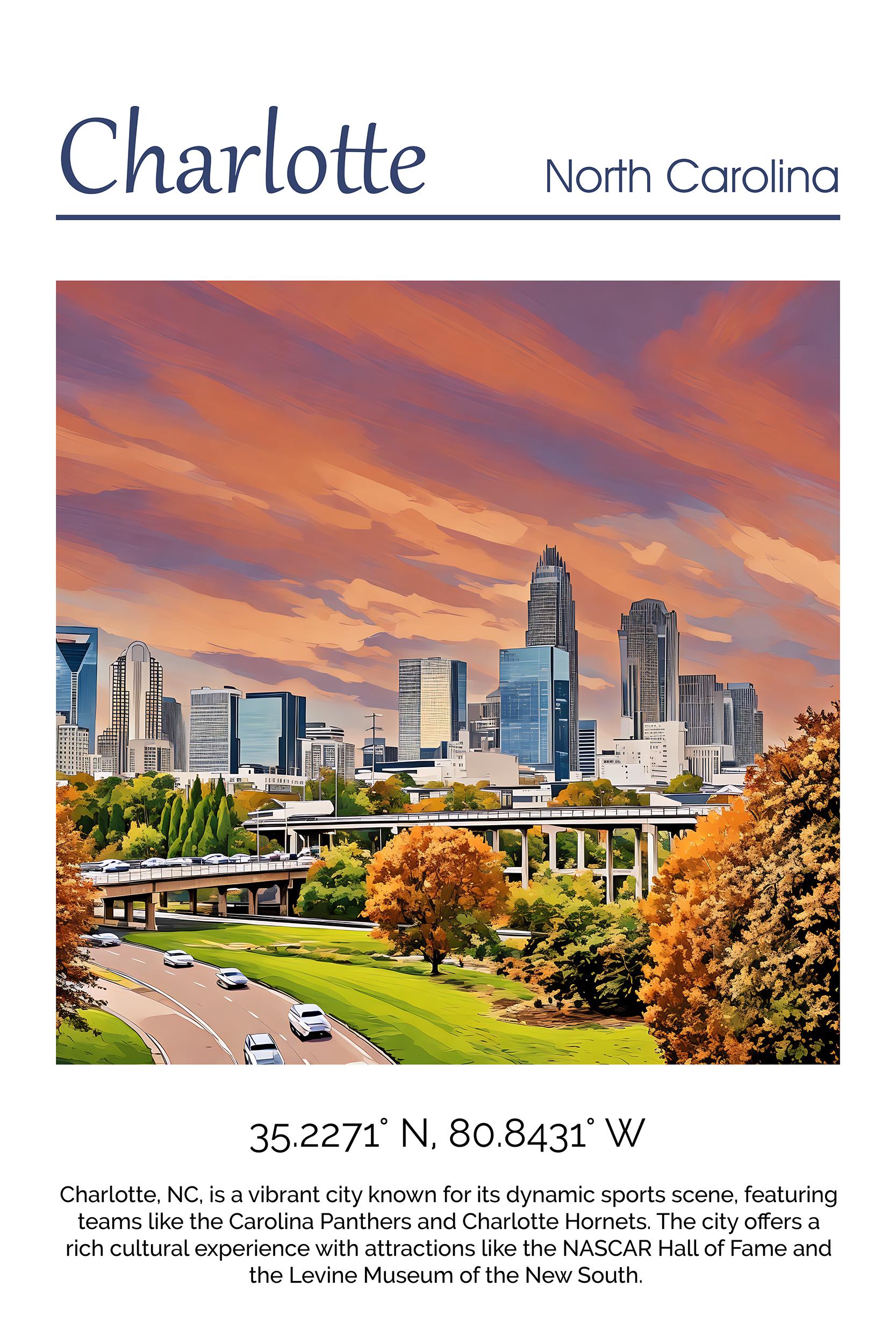 Bring the charm of Charlotte into your home with this stunning Charlotte travel art canvas print. Featuring a picturesque depiction of this beautiful southern city, this wall art is sure to add a touch of elegance to any room in your home.
