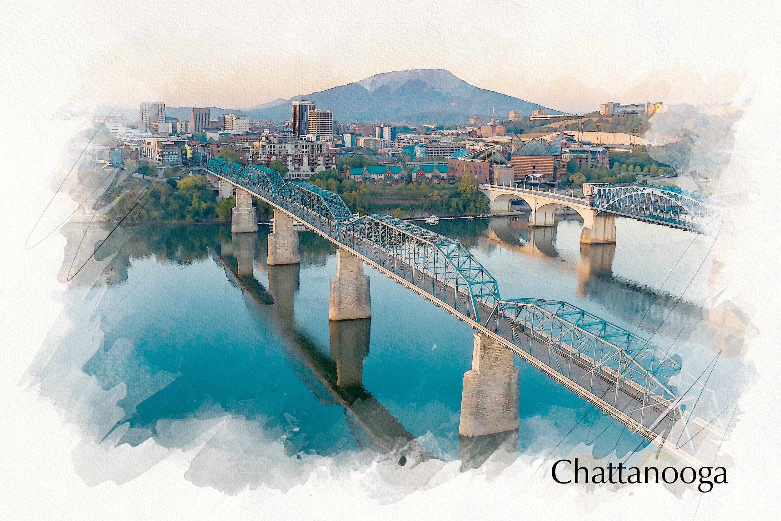 The beautiful sketch watercolor of Chattanooga on canvas framed and ready to hang. Stunning colors that make for the perfect wall decor. Chattanooga watercolor canvas, Chattanooga print