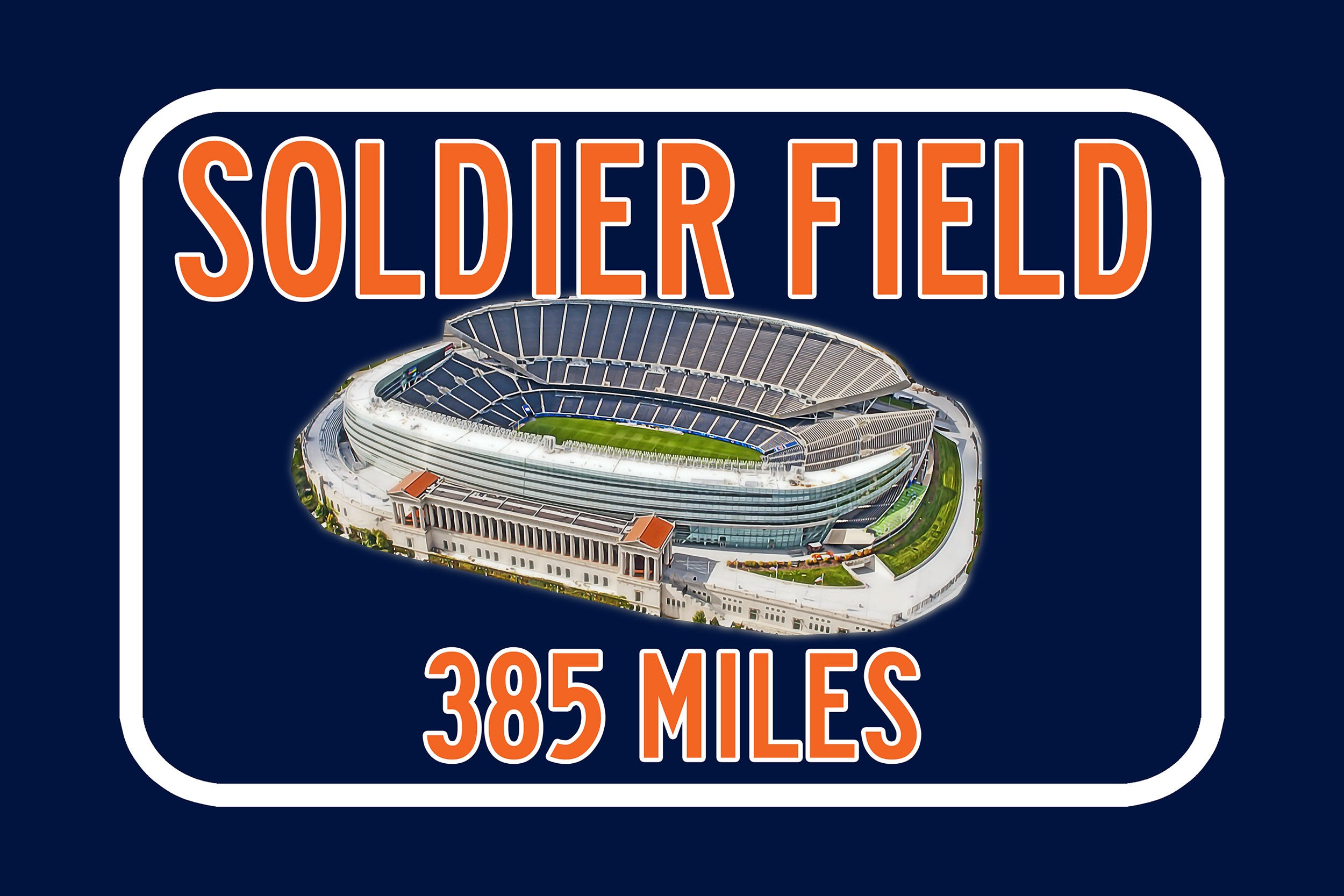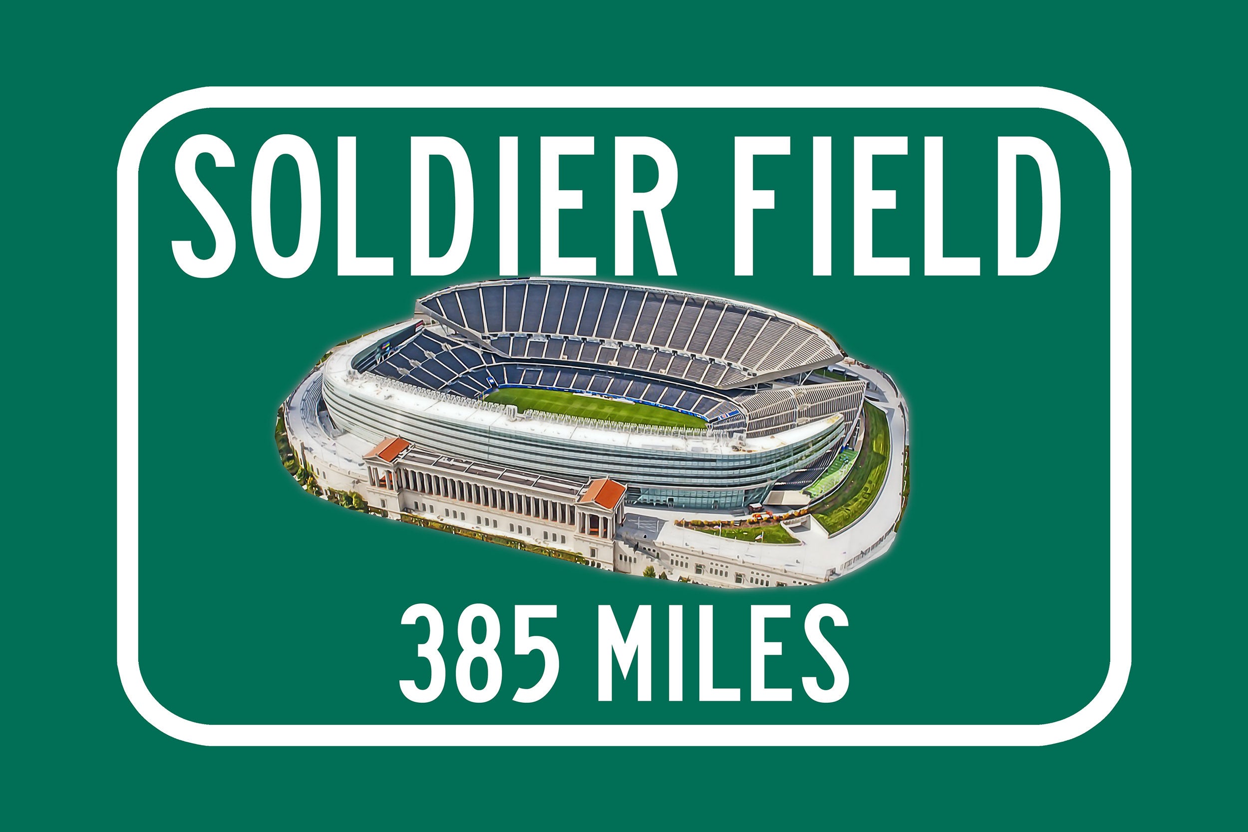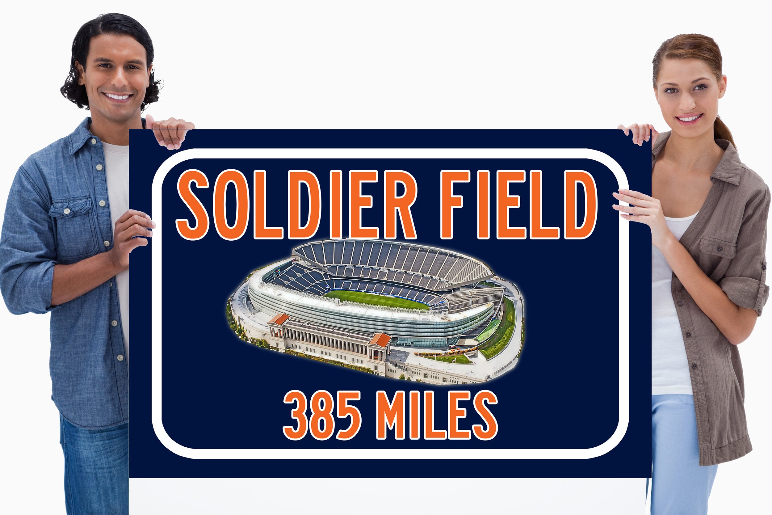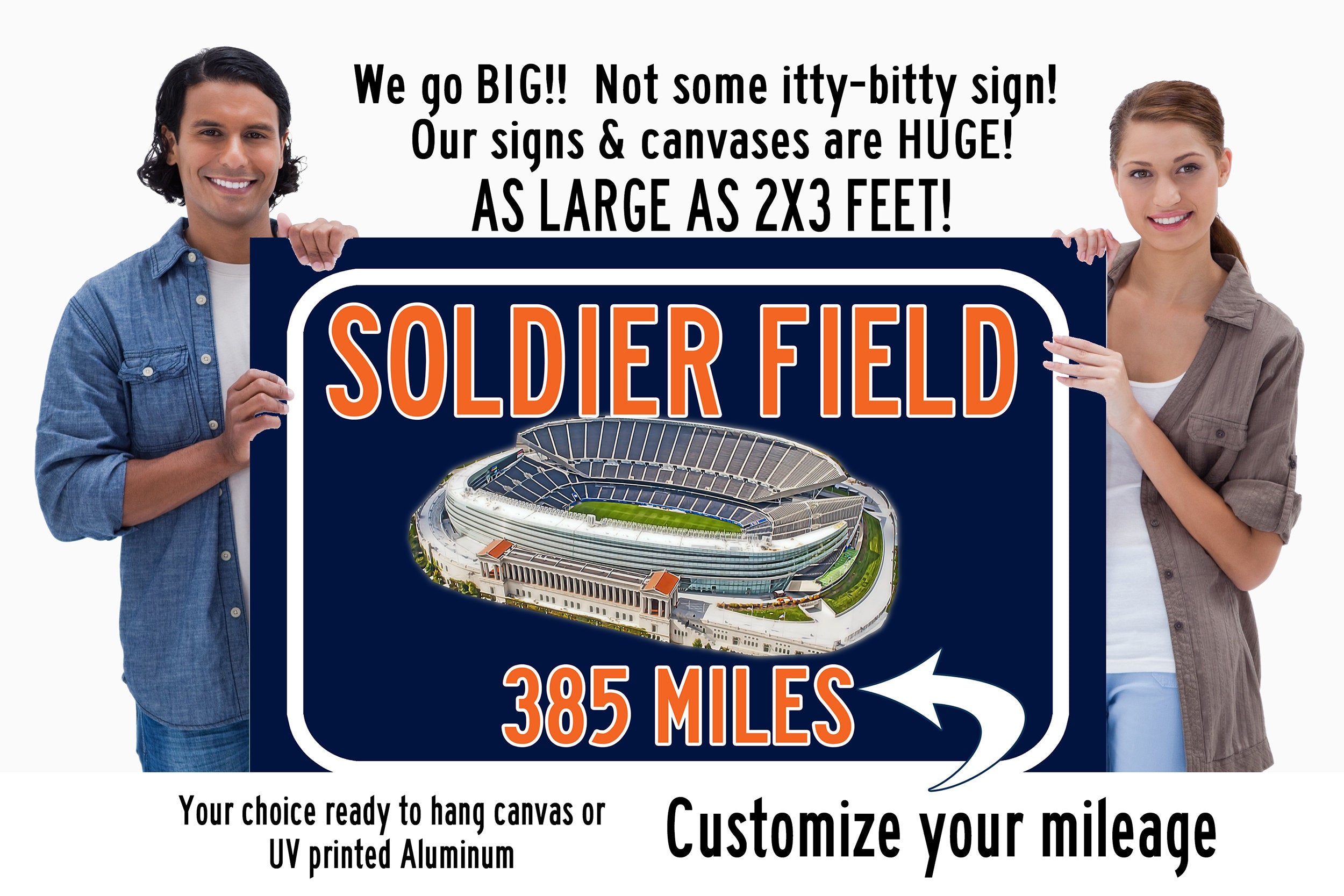 Personalized Highway Distance sign to Soldier Field in Chicago. Custom replica road sign, with a watercolor photo of the stadium made with real distance from you to Soldier Field. WE GO HUGE!! Not some itty-bitty sign, Our signs are as large as 2 x 3 FEET! Soldier Field highway sign. Chicago bears sign