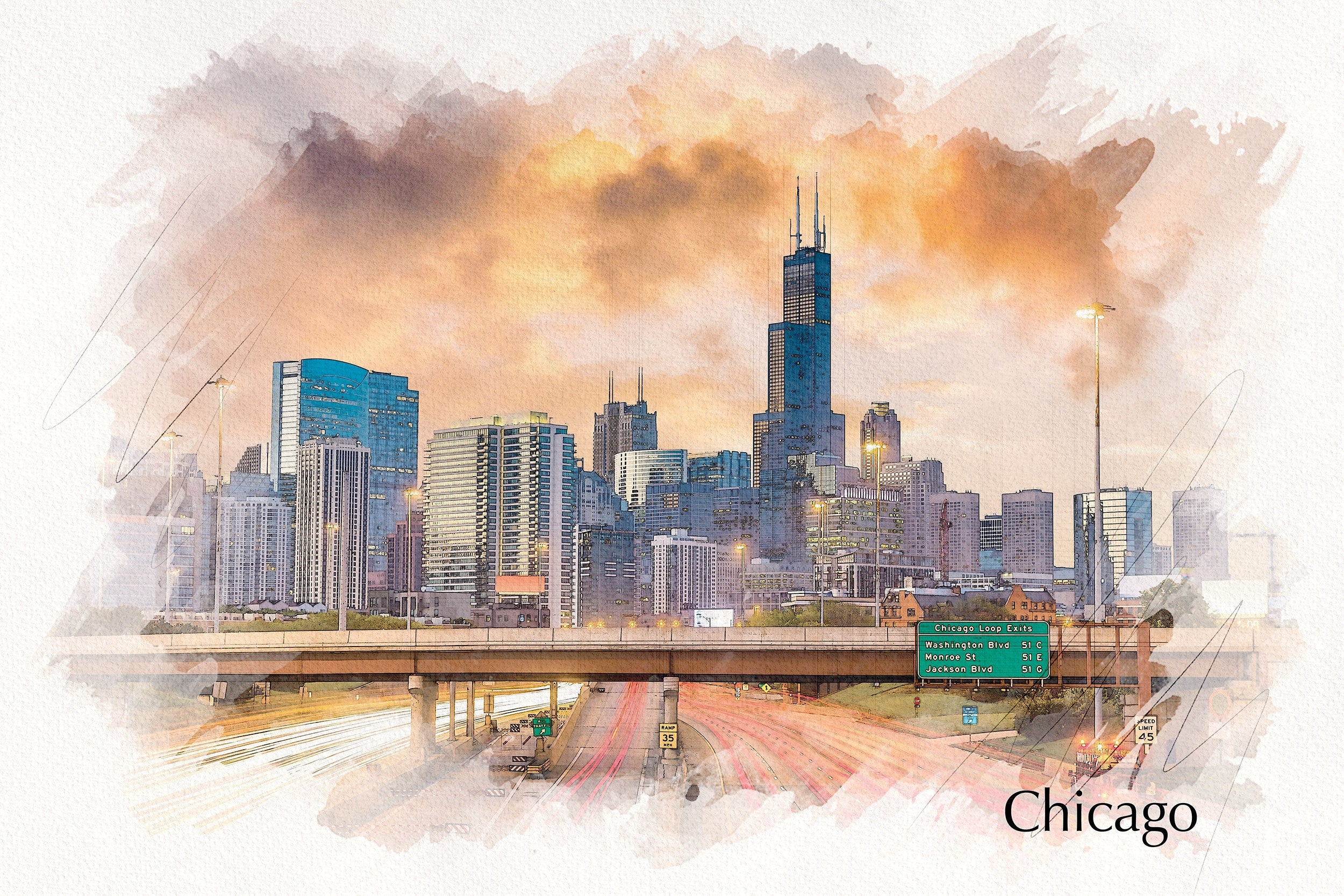 Stunning Watercolor of the Chicago skyline on canvas Great for a piece of wall art. Available as a single canvas at 16″ x 24″ , 24″ x 36″ , or 32″ x 48″ or we can make you a special 3 panel work of art. Chicago watercolor wall art