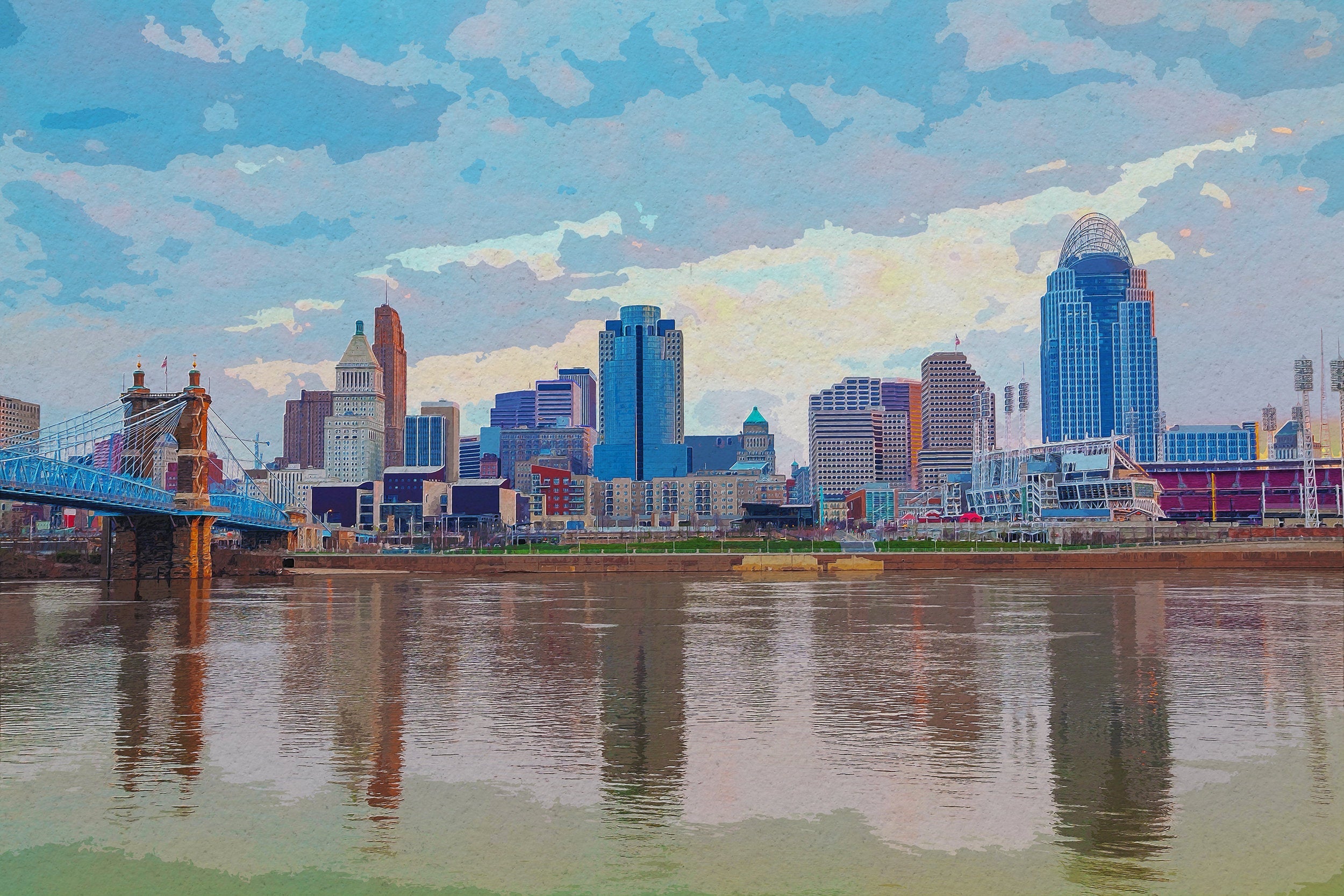 Stunning watercolor of the Cincinnati skyline. Cincinnati watercolor canvas Great for a piece of wall art. Great for a piece of wall art. Available as a single canvas at 16″ x 24″ , 24″ x 36″ , or 32″ x 48″ or we can make you a special 3 panel work of art as large as 4 x 8 foot wide. If ordering the digital download, no product is sent, just the image file