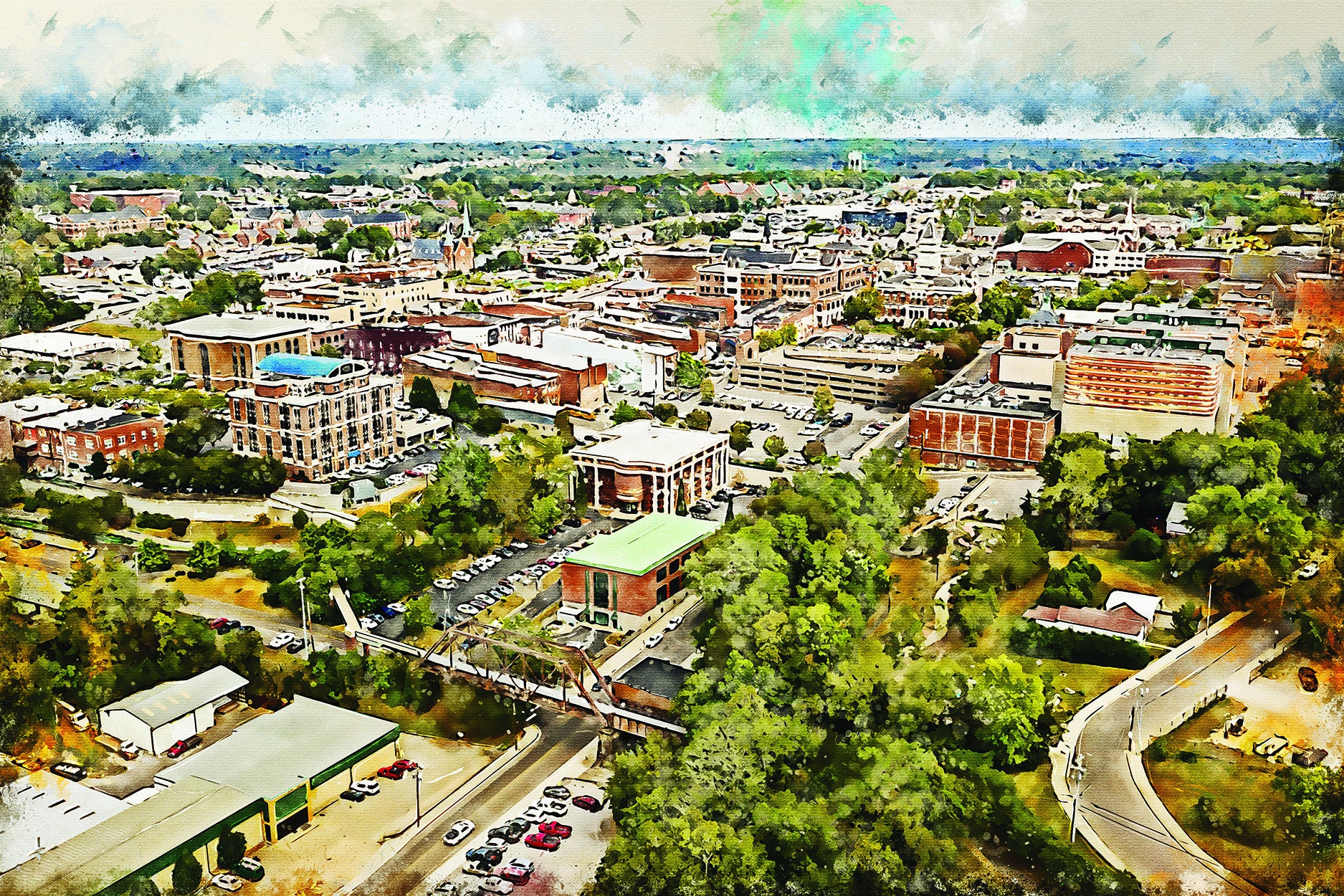 The beautiful watercolor of Clarksville on canvas framed and ready to hang. Stunning colors that make for the perfect wall decor. Clarksville watercolor