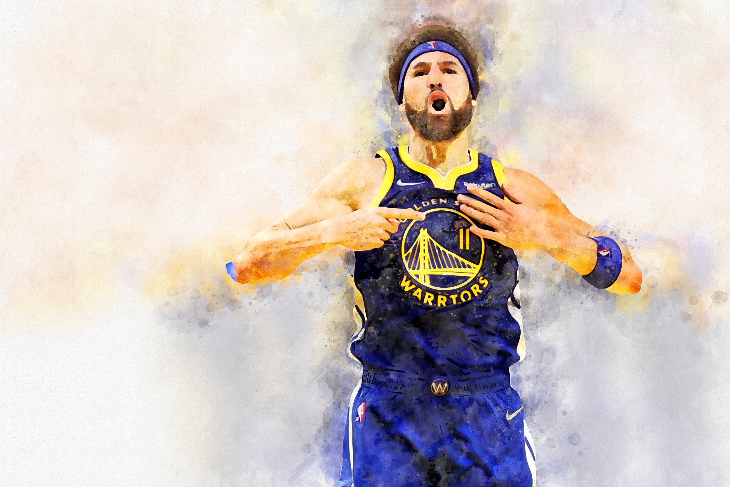 Beautiful watercolor of Clay Thompson playing for the Golden State Warriors.