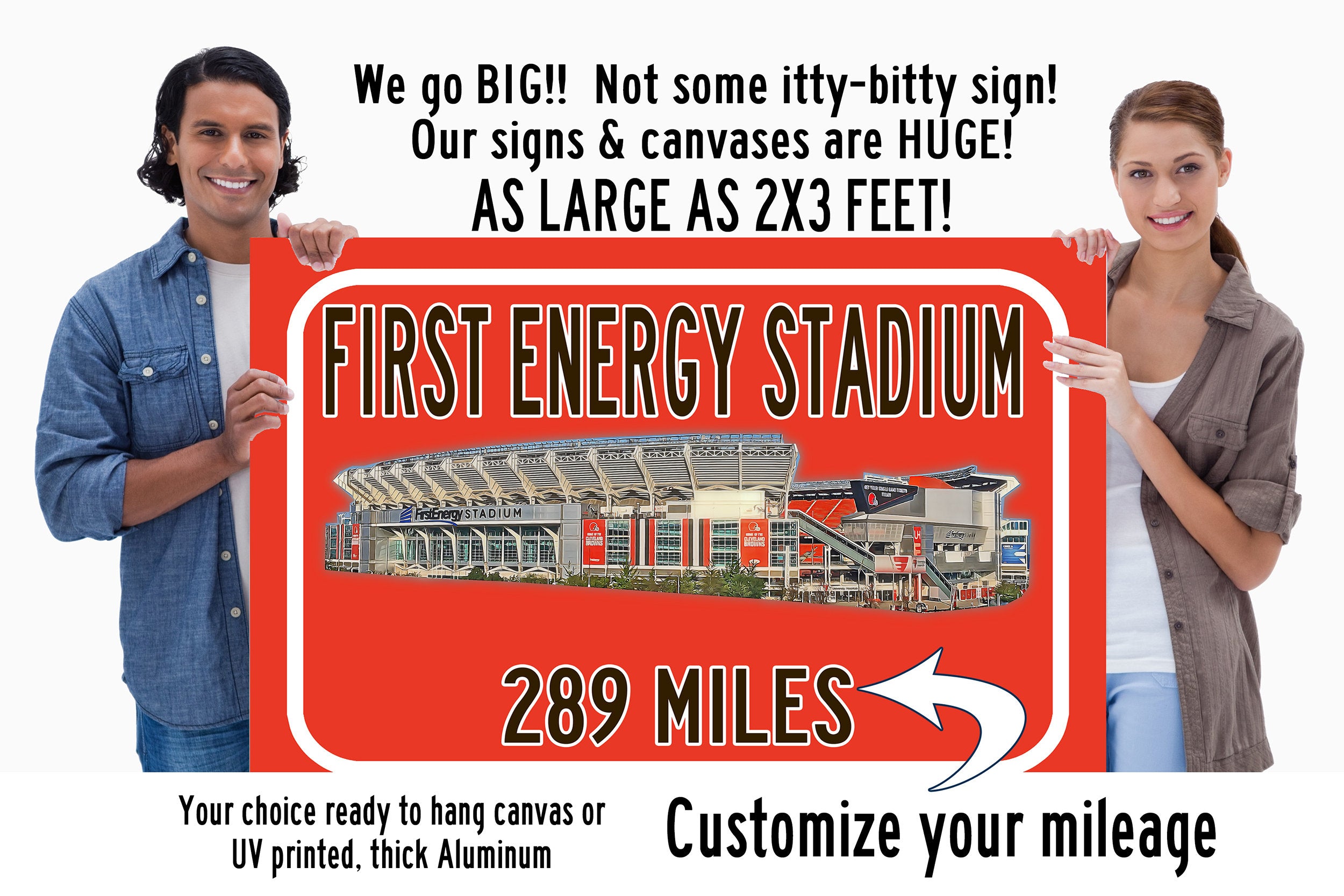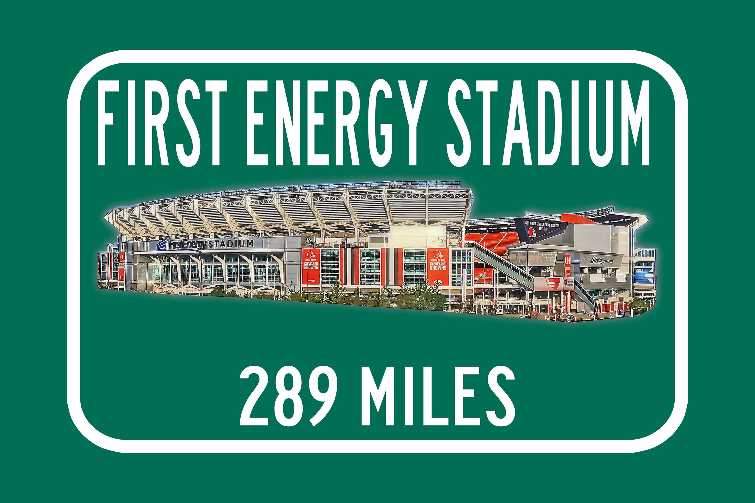 Personalized Highway Distance sign to First Energy Stadium in Clevelan. Custom replica road sign, with a watercolor photo of the stadium made with real distance from you to First Energy Stadium. WE GO HUGE!! Not some itty-bitty sign, Our signs are as large as 2 x 3 FEET! First Energy Stadium highway sign. Cleveland Brows sign