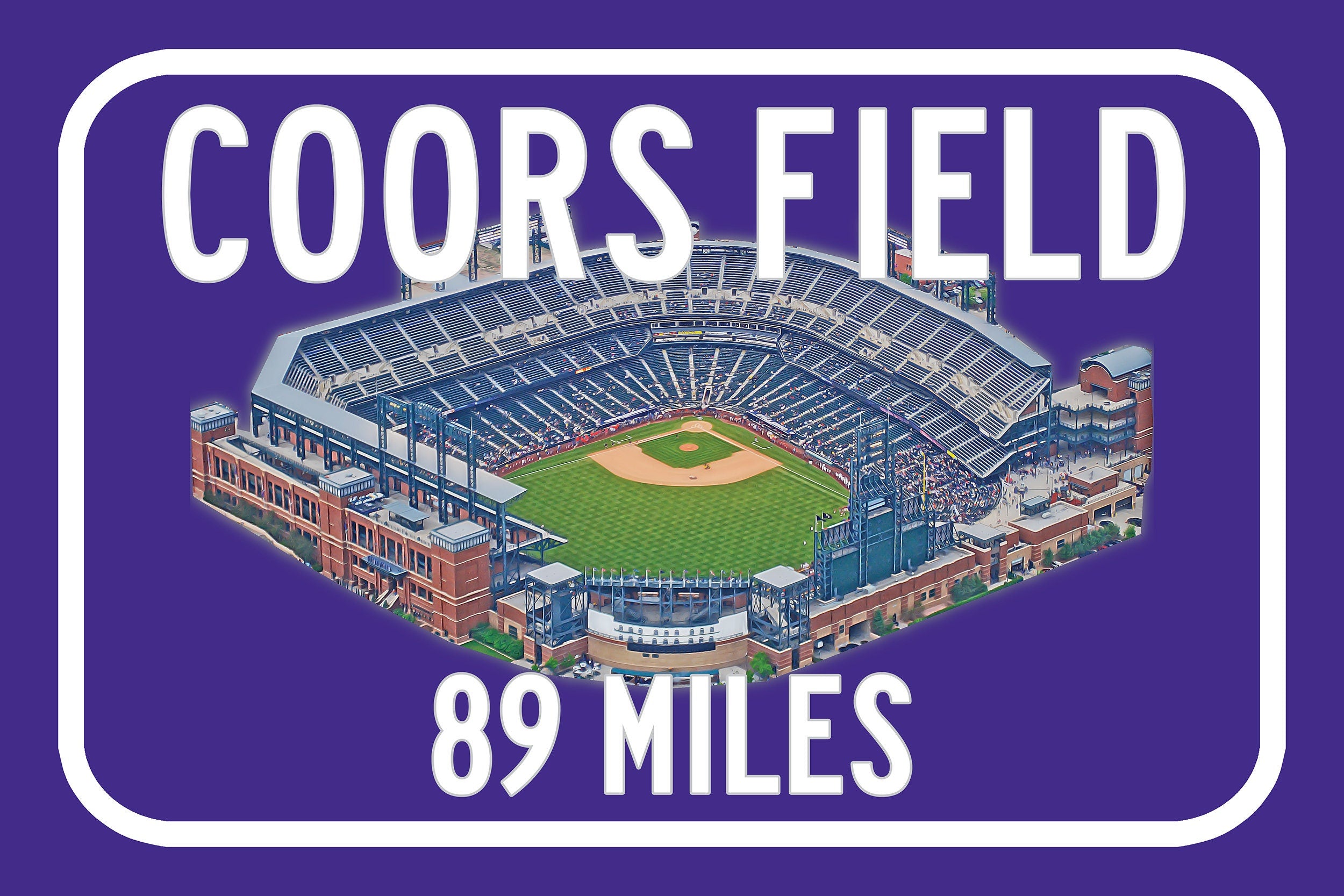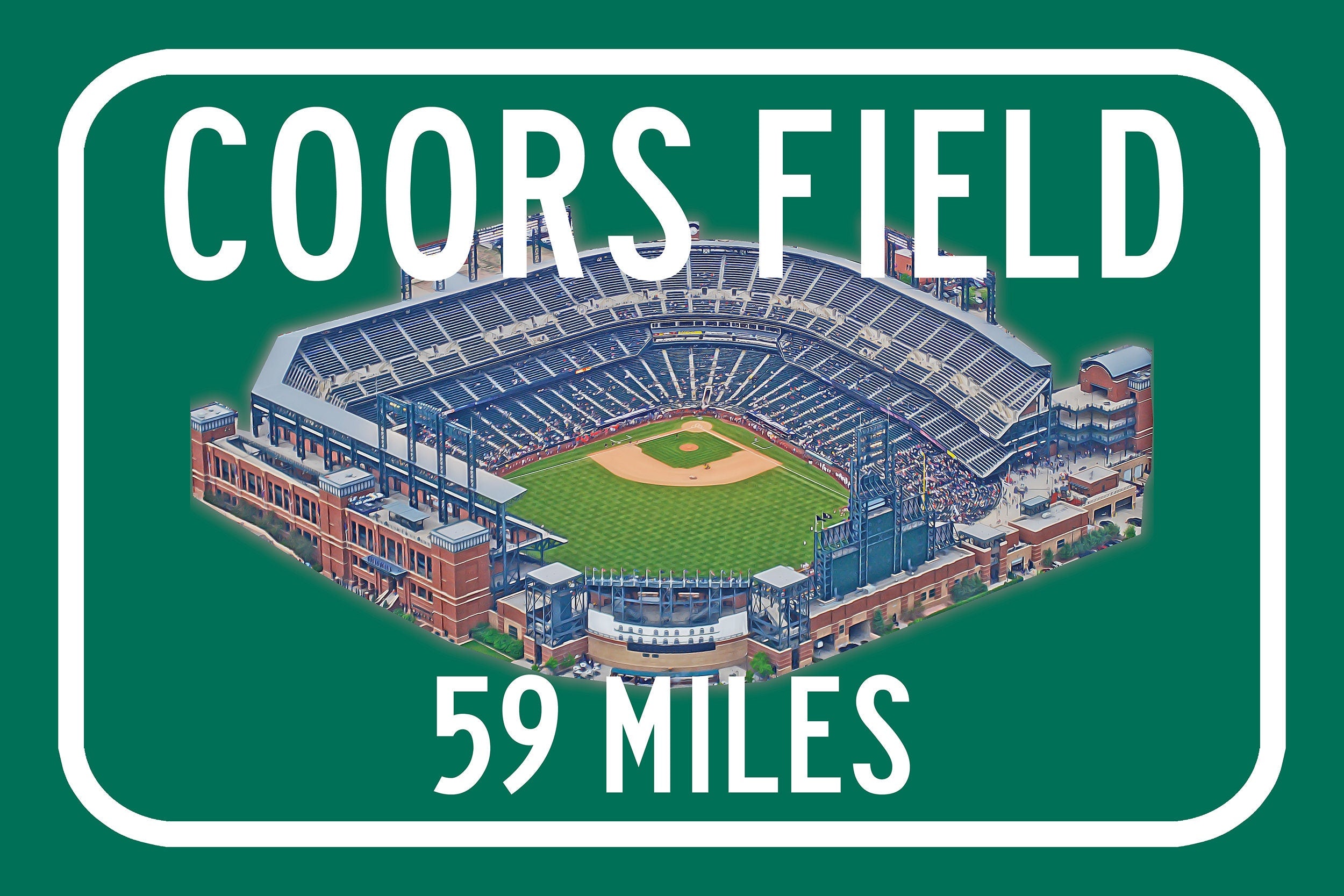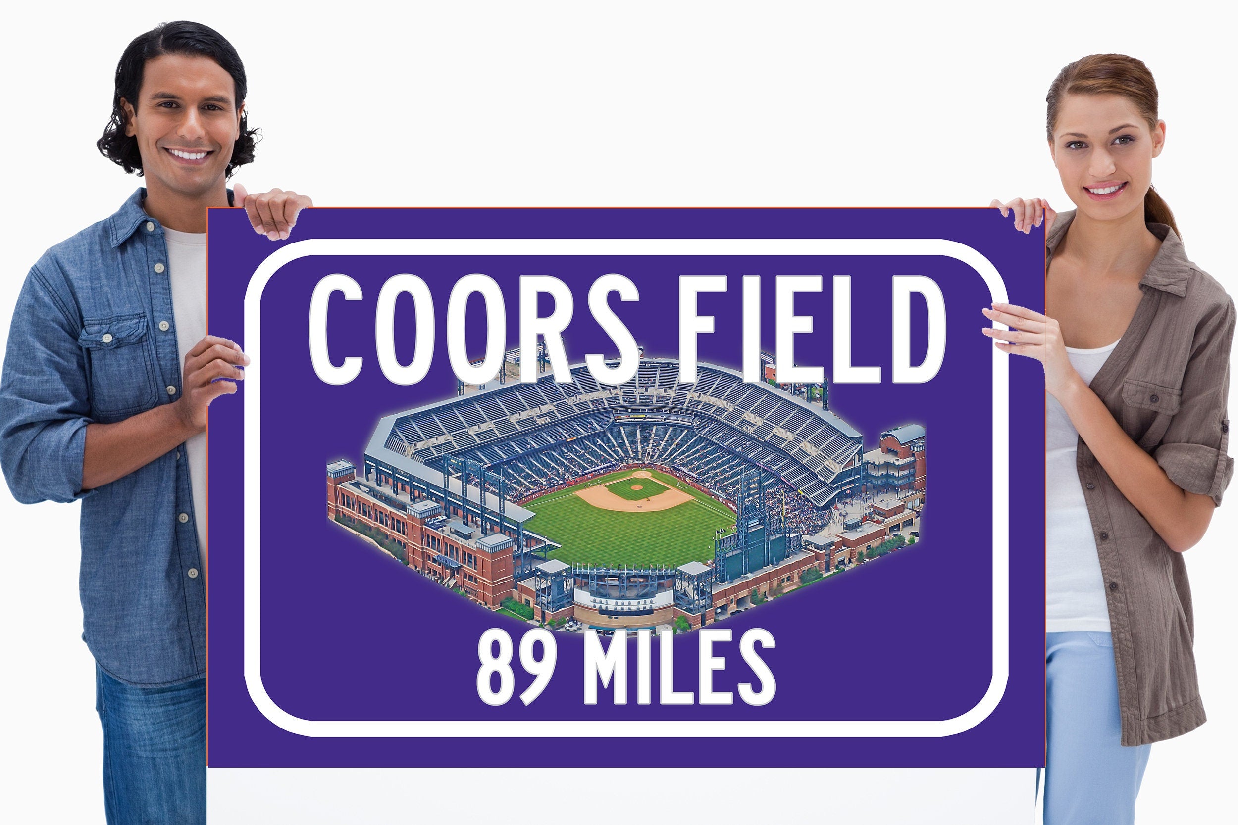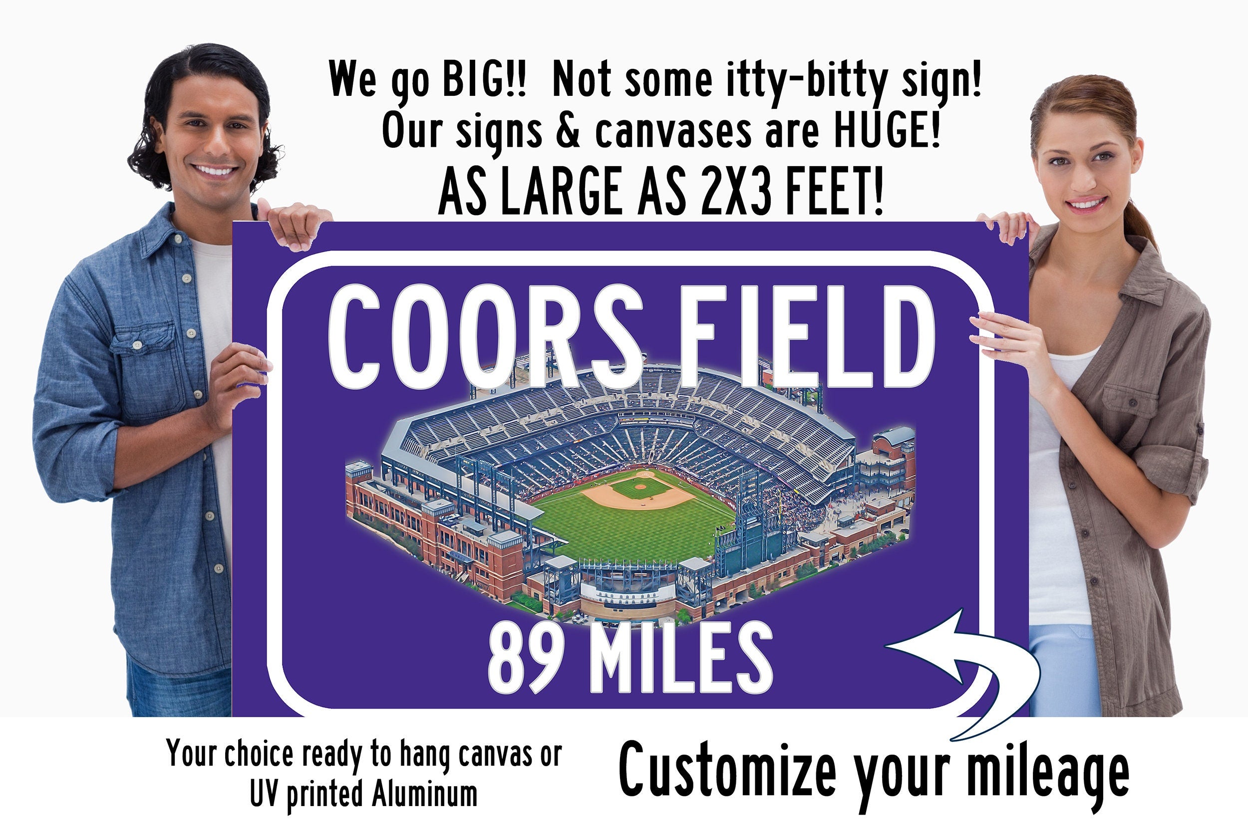 Personalized Highway Distance sign to Coors Field in Denver. Custom replica road sign, with a watercolor photo of the stadium made with real distance from you to Coors Field. WE GO HUGE!! Not some itty-bitty sign, Our signs are as large as 2 x 3 FEET! Coors Field highway sign. Colorado Rockies Sign. A unique gift for people who love the Colorado Rockies Great for a bar, pool area, restaurants and bars, man-cave or she-shed and so much more.