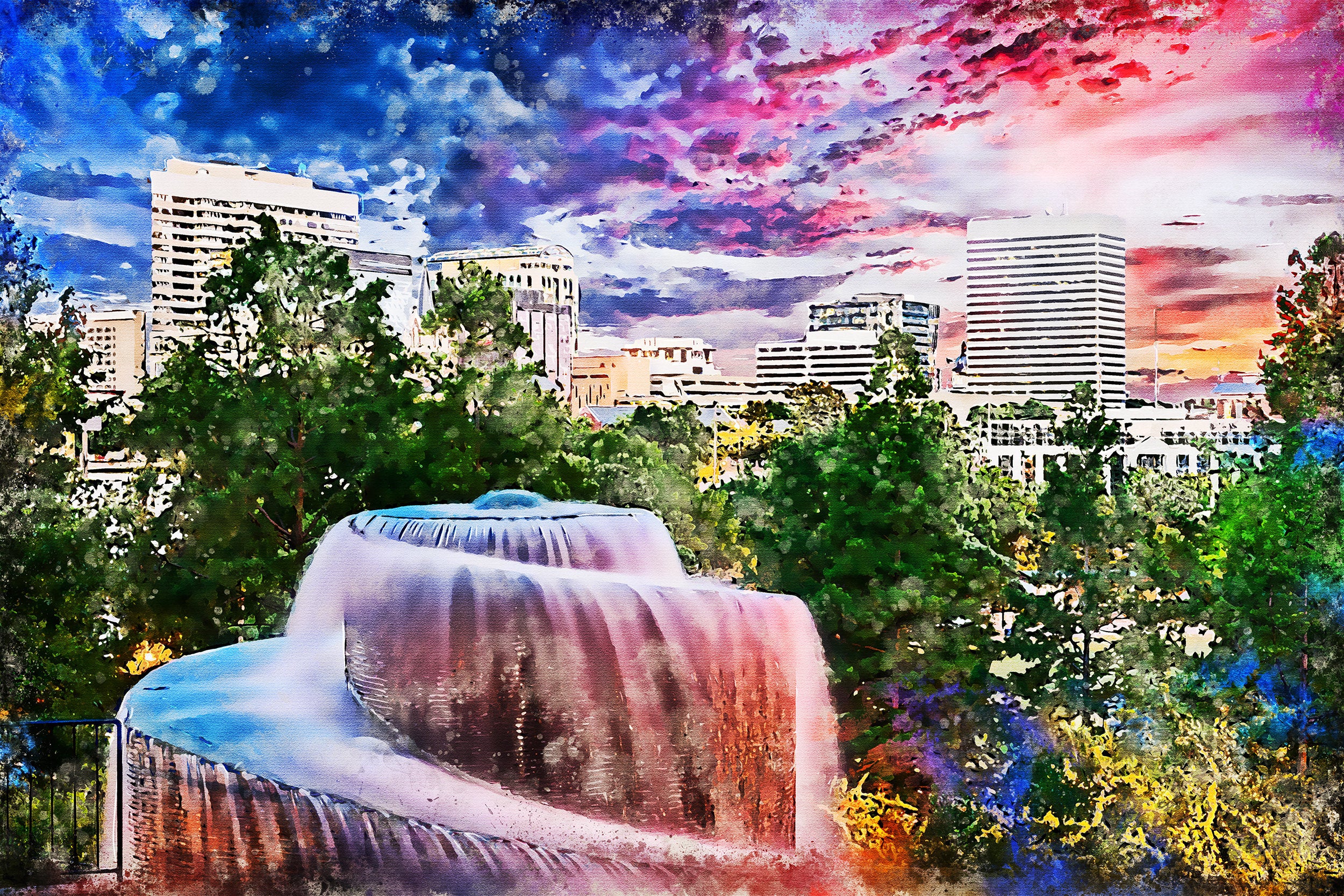 The beautiful skyline of Columbia South Carolina from Findley Park on canvas framed and ready to hang. Stunning colors that make for the perfect wall decor. Columbia South Carolina skyline canvas