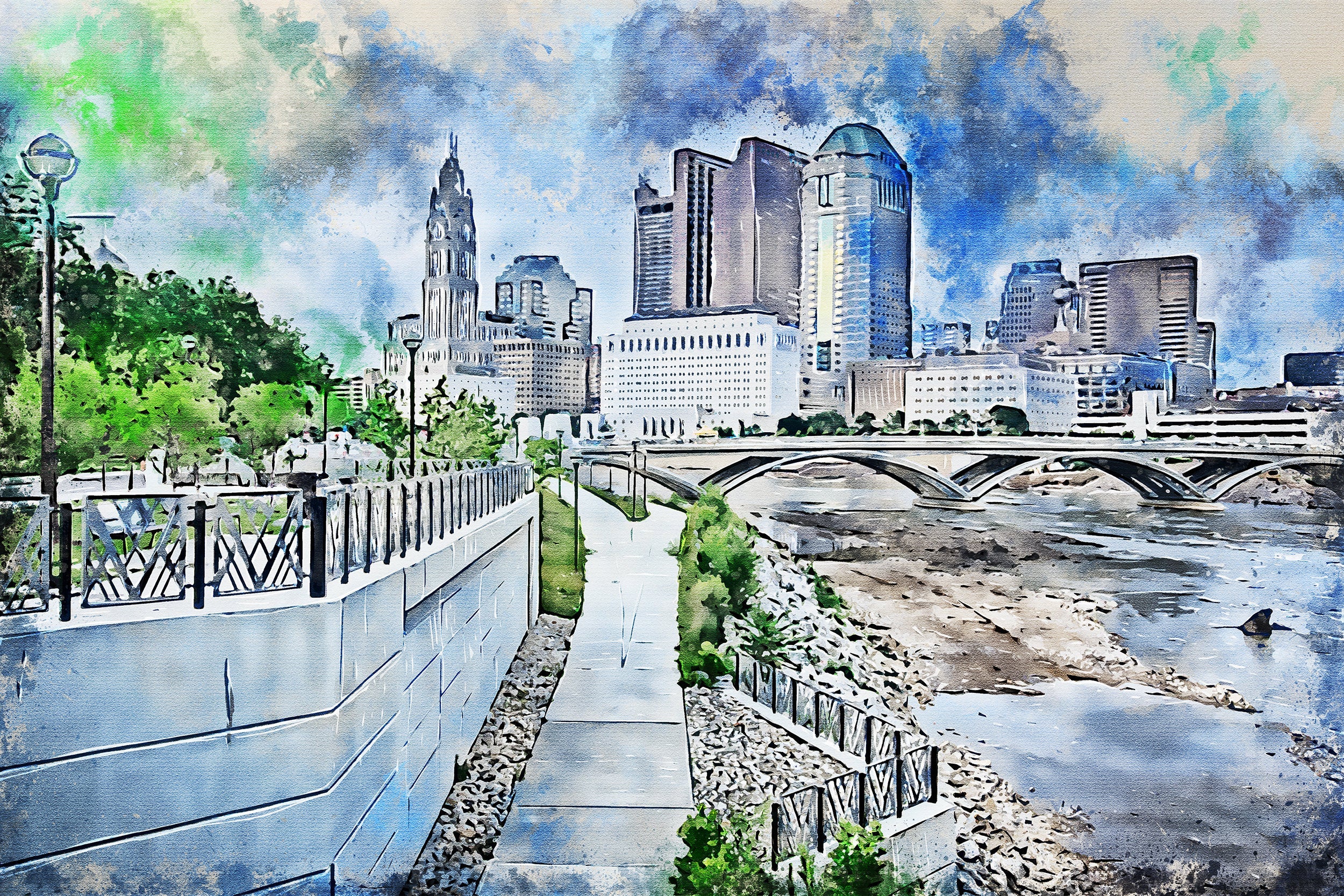 Stunning watercolor of Columbus Ohio. Columbus watercolor canvas. Great for a piece of wall art. Available as a single canvas at 16″ x 24″ , 24″ x 36″ , or 32″ x 48″ or we can make you a special 3 panel work of art as large as 4 x 8 foot wide.
