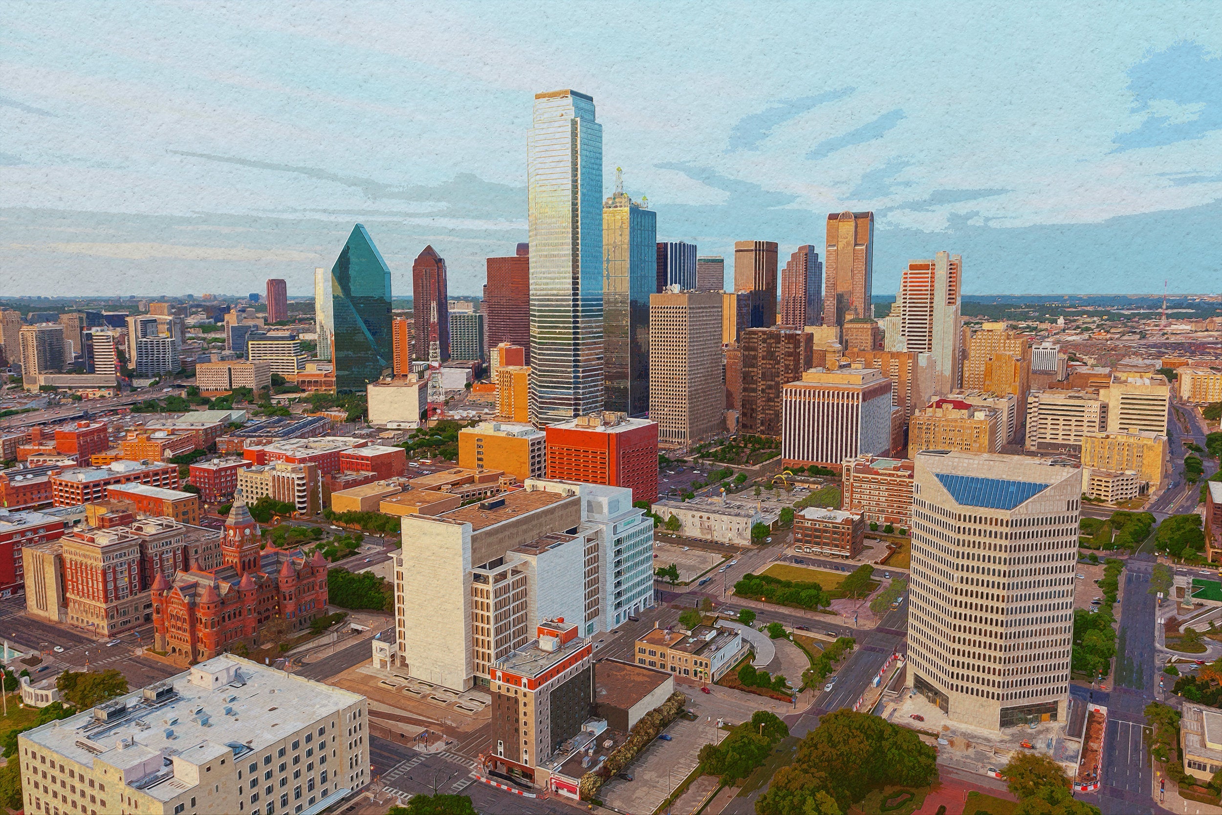 The skyline of Dallas watercolor at dusk. Dallas TX watercolor. Great colors and plenty of lights. Great for a piece of wall art. Available as a single canvas at 16″ x 24″ , 24″ x 36″ , or 32″ x 48″ or we can make you a special 3 panel work of art as large as 4 x 8 foot wide or get the digital file and you can print it yourself. ( Digital File only, no product included)