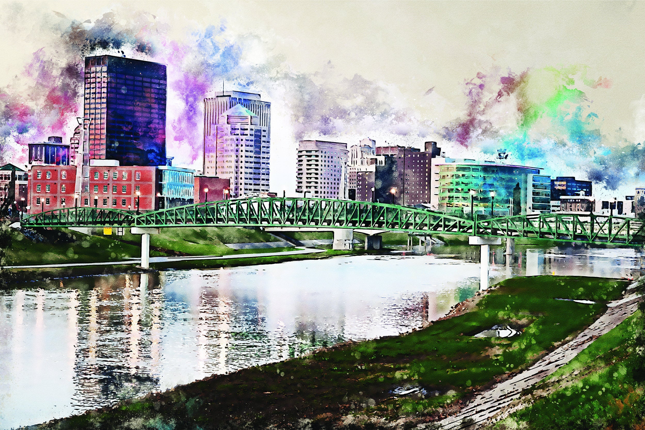 The beautiful watercolor of Dayton Ohio on canvas framed and ready to hang. Stunning colors that make for the perfect wall decor. Dayton watercolor