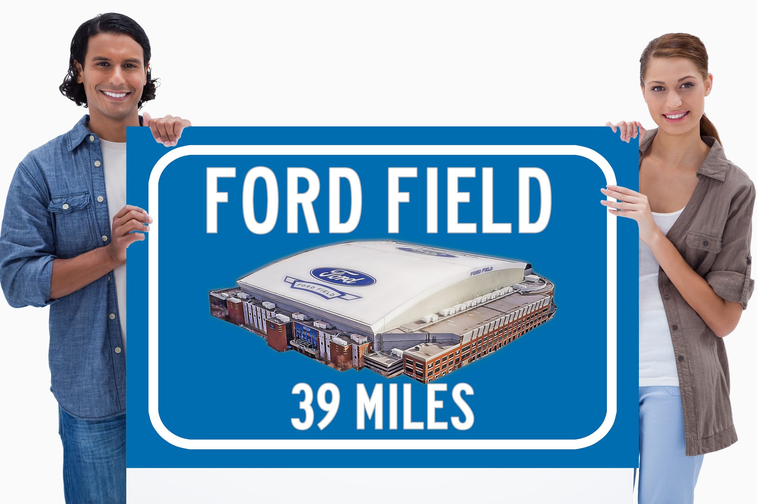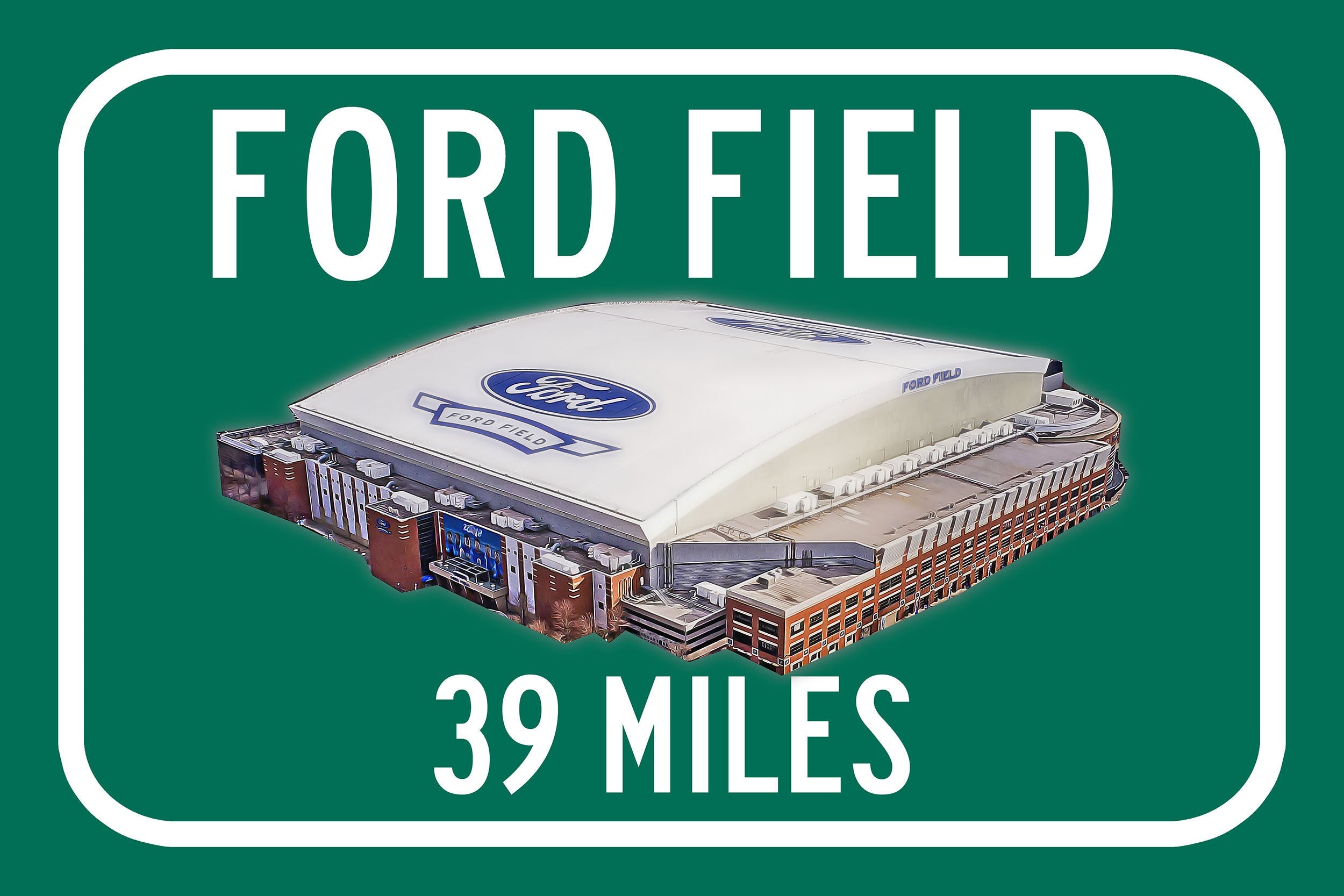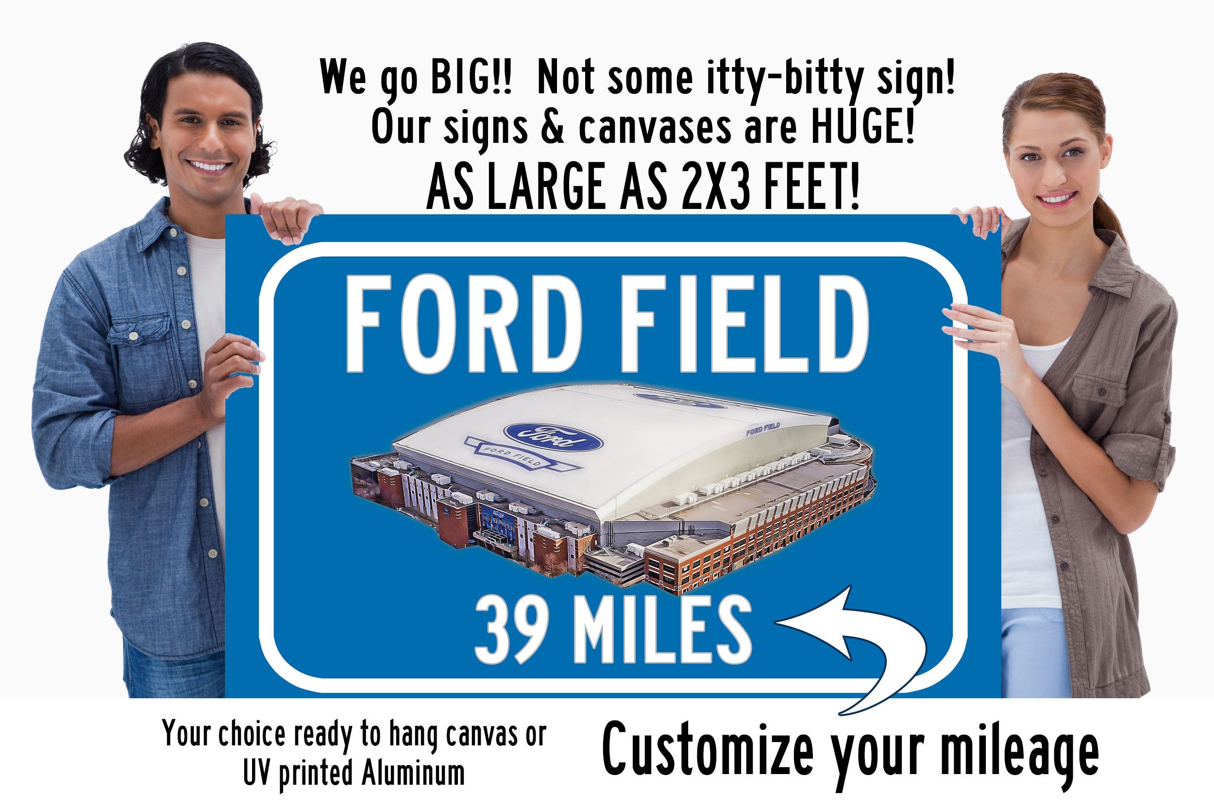 Personalized Highway Distance sign to Ford Field in Detroit. Custom replica road sign, with a watercolor photo of the stadium made with real distance from you to Ford Field. WE GO HUGE!! Not some itty-bitty sign, Our signs are as large as 2 x 3 FEET! Detroit Lions highway sign. Ford Field sign