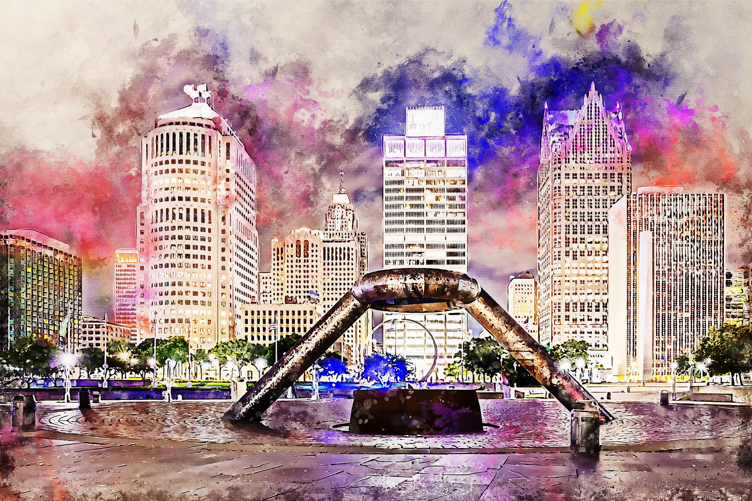 The skyline of Detroit. Detroit Michigan watercolor canvas Great for a piece of wall art. Available as a single canvas at 16″ x 24″ , 24″ x 36″ , or 32″ x 48″ or we can make you a special 3 panel work of art as large as 4 x 8 foot wide. Digital download will be the file only, no product will be sent