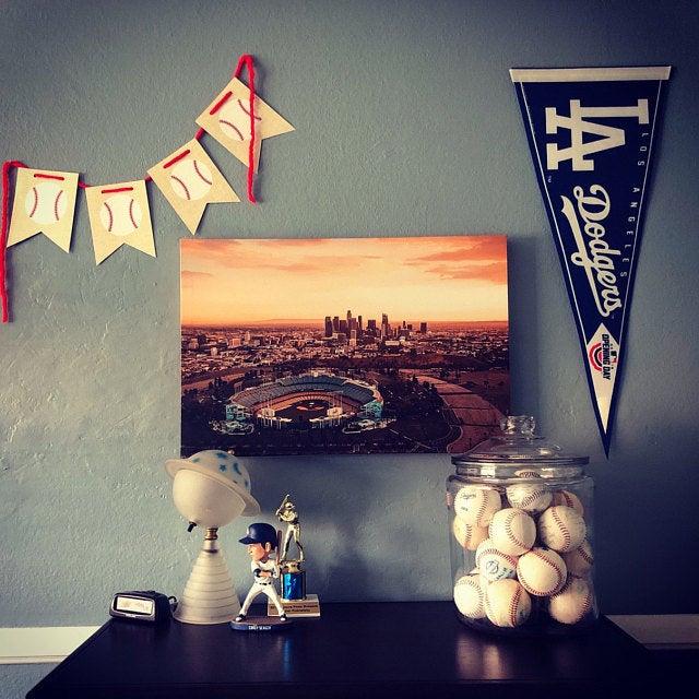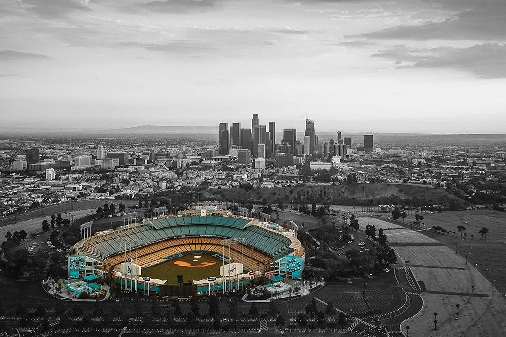 Dodger Stadium and the Skyline of Los Angeles. Color Stadium and Black and White skyline. See our other listing for the full color version Available as a SINGLE canvas at 12″ x 18″, 16″ x 24″ , 24″ x 36″.