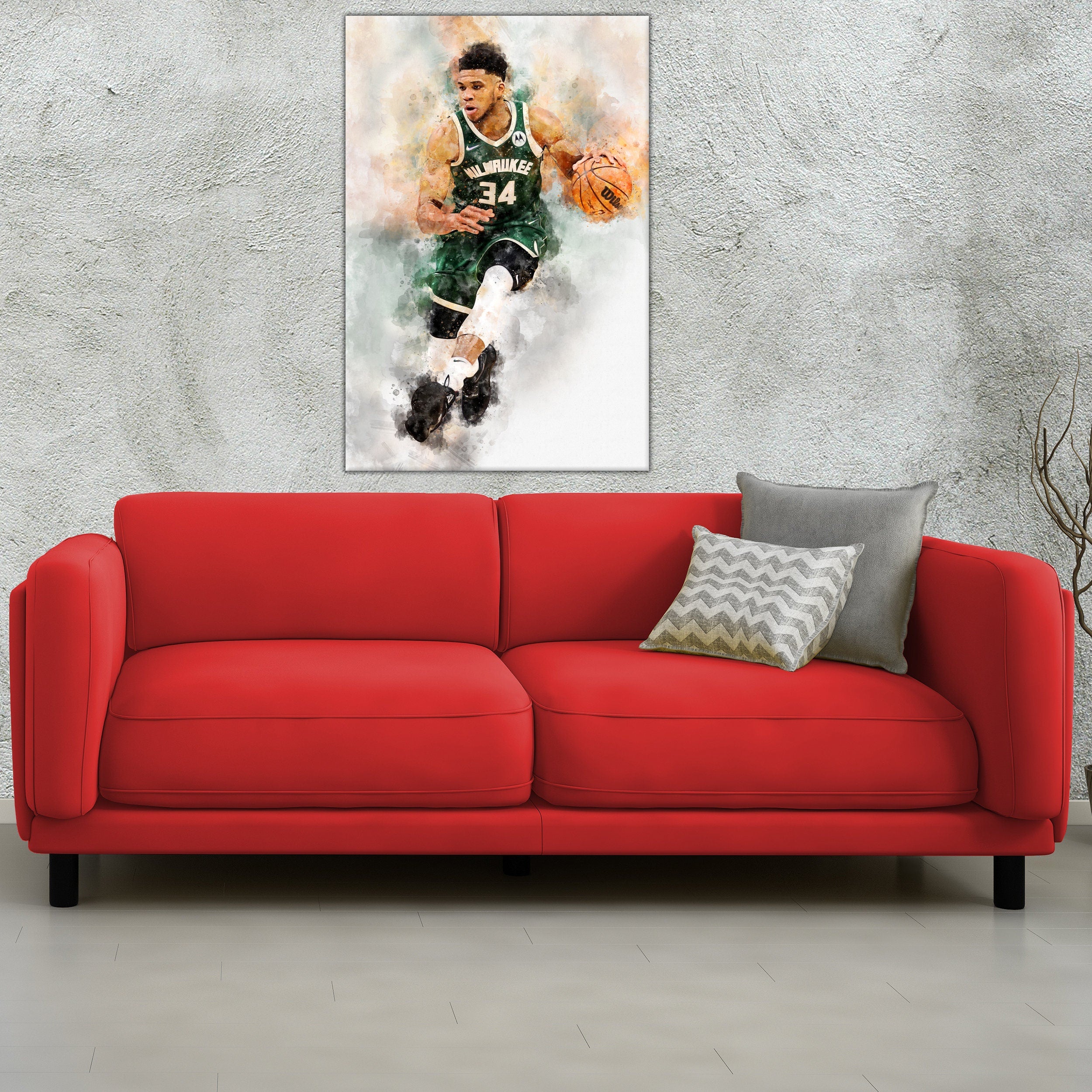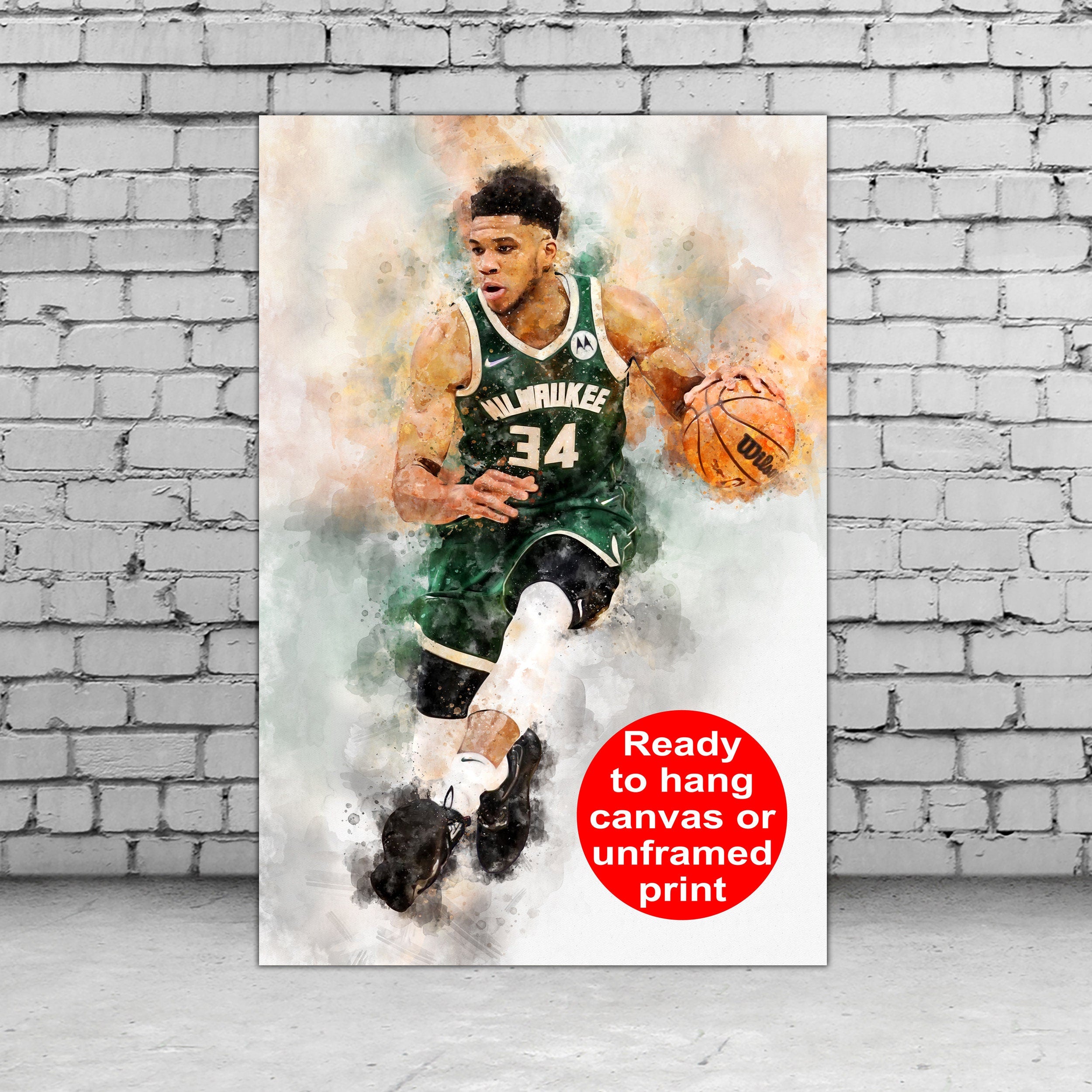 Great for a piece of Giannis Antetokounmpo wall art. Available in several sizes as an unframed print or a ready to hang mounted canvas