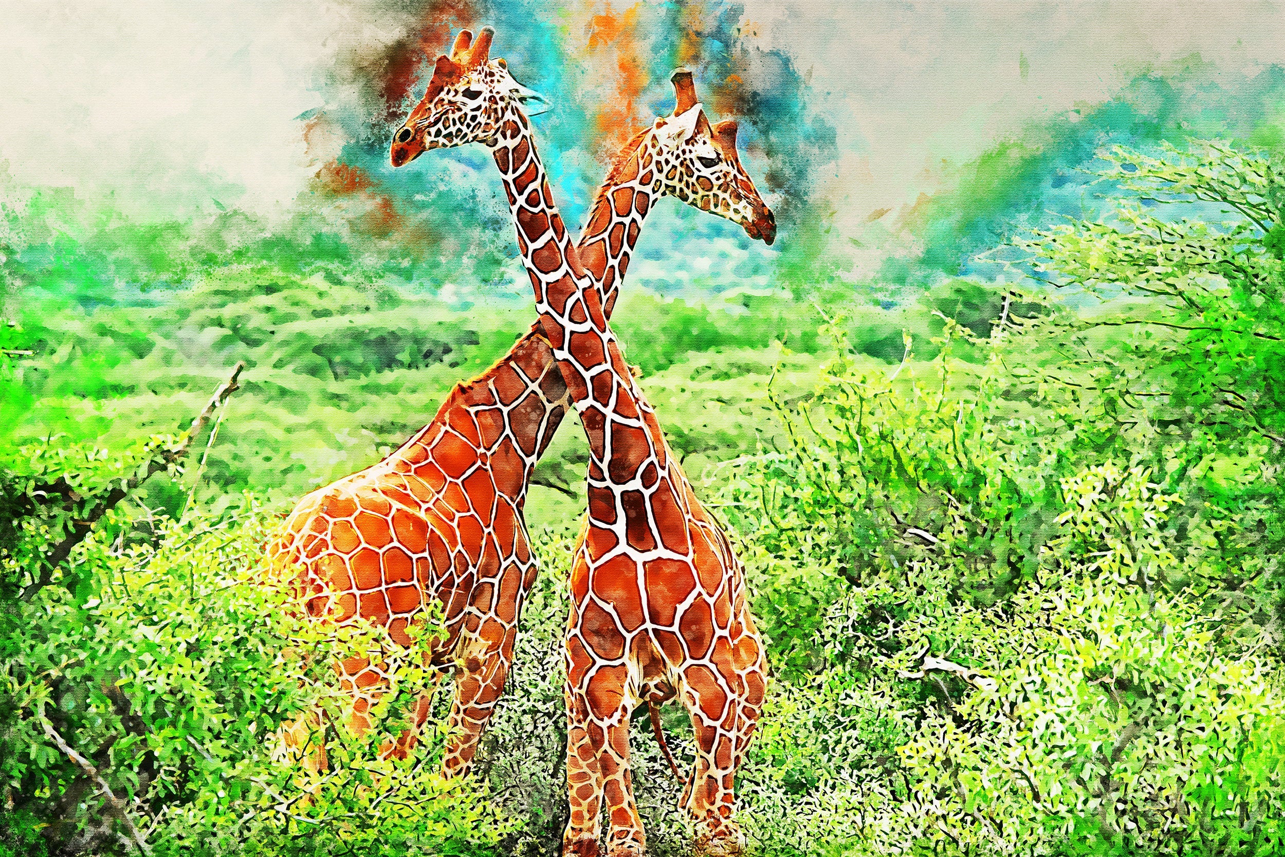 Lovely watercolor of 2 giraffes. Perfect wildlife wall art Great for a piece of wall art. Available as a single canvas at 16″ x 24″ , 24″ x 36″ , or 32″ x 48″ or we can make you a special 3 panel work of art at 2.5 x 3 foot wide or if you prefer, a digital download and you can print it your self. (no physical product sent)