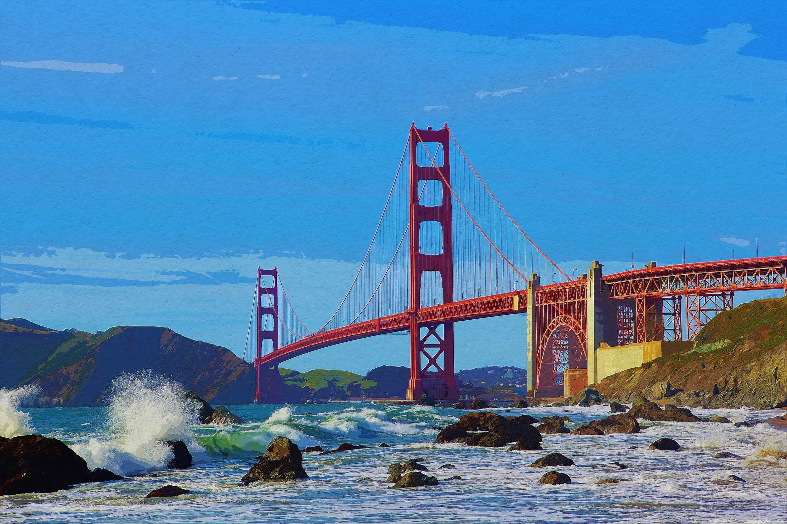 Lovely picture of the Golden Gate Bridge in San Francisco. Taken from Baker beach Available as a single canvas at 16″ x 24″ , 24″ x 36″ , or 32″ x 48″ or we can make you a special 3 panel work of art as large as 4 x 8 foot wide. Golden Gate Bridge watercolor