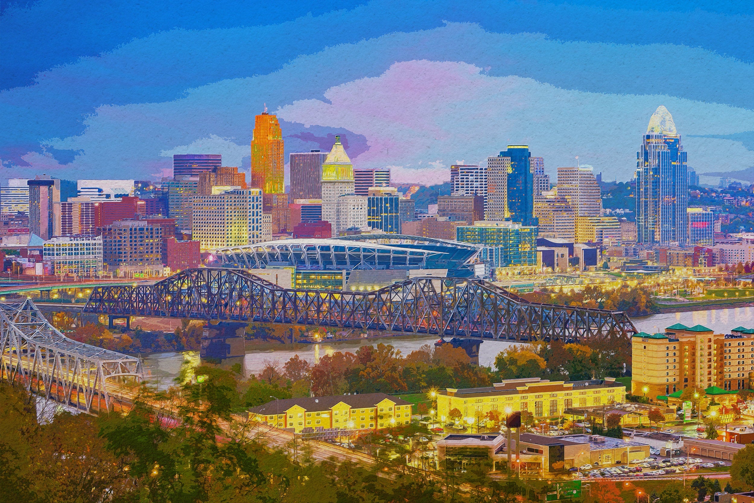 Stunning watercolor of the Cincinnati Ohio skyline. Great for a piece of wall art. Great for a piece of wall art. Available as a single canvas at 16″ x 24″ , 24″ x 36″ , or 32″ x 48″ or we can make you a special 3 panel work of art as large as 4 x 8 foot wide. Cincinnati watercolor