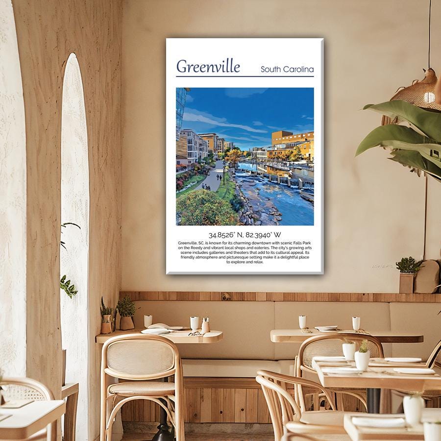 Add this Greenville travel art canvas print to your collection today and let the charm of this city brighten up your space!