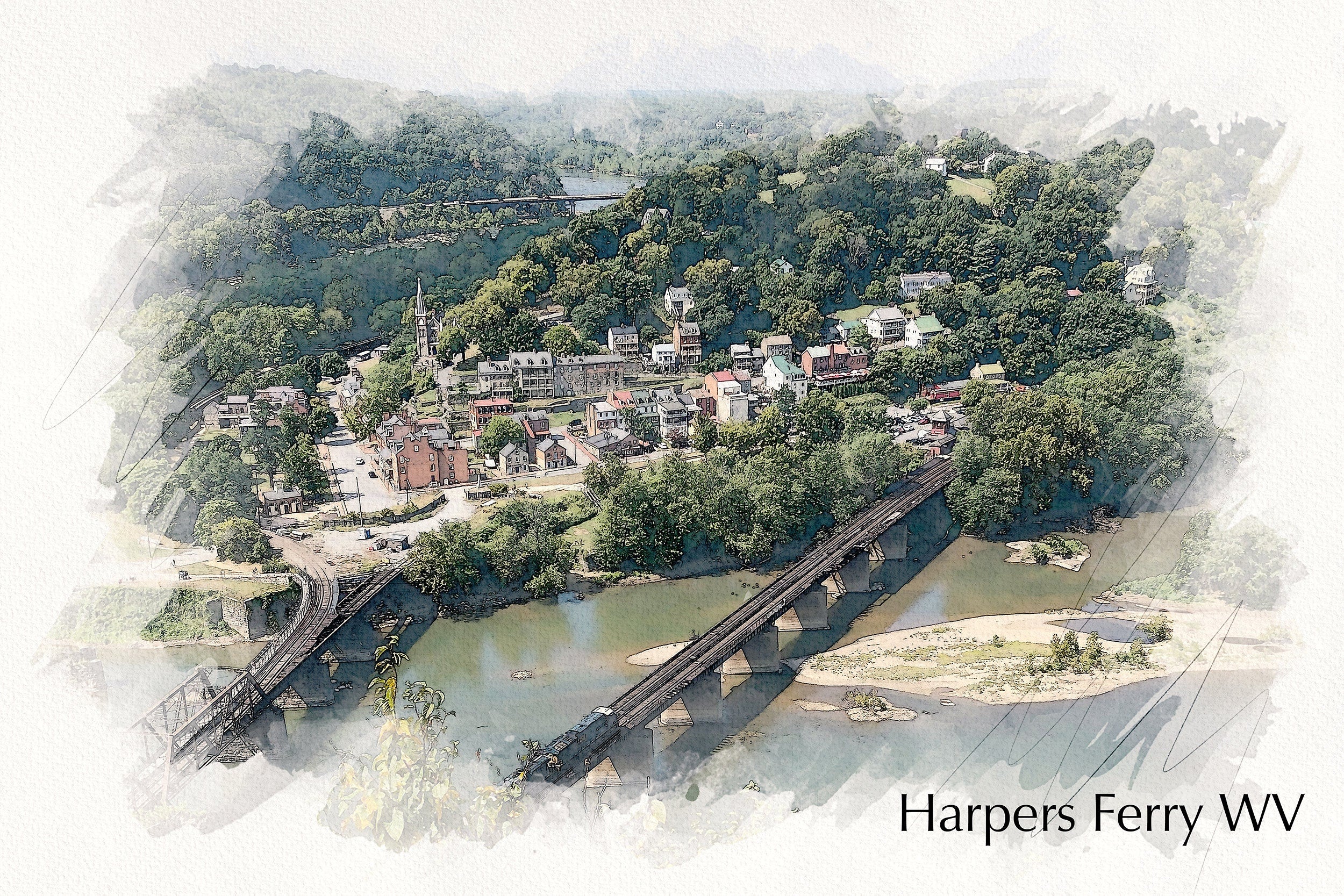 The beautiful of sketch watercolor Ferry WV on canvas framed and ready to hang. Stunning colors that make for the perfect wall decor. Harpers Ferry watercolor canvas