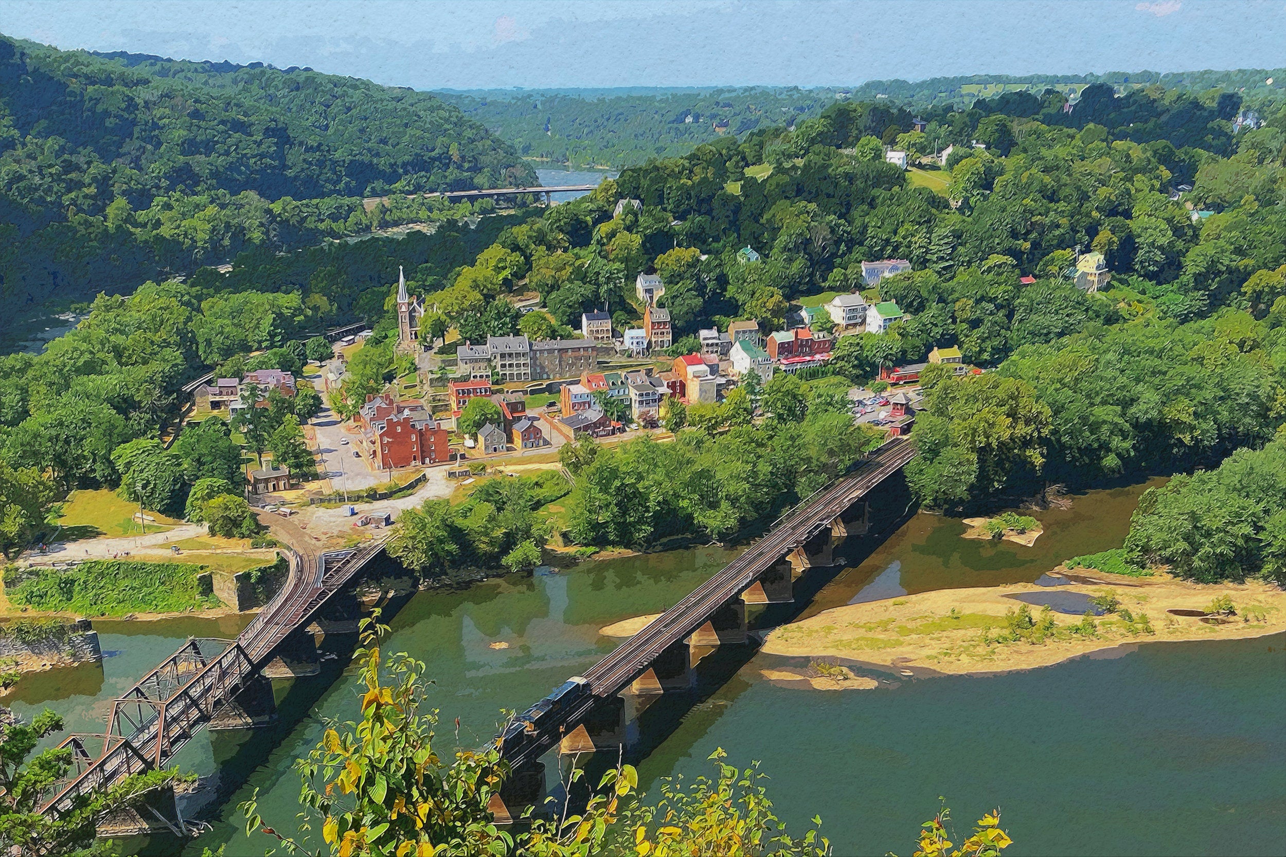 The beautiful town of Harpers Ferry WV on canvas framed and ready to hang. Stunning colors that make for the perfect wall decor. Harpers Ferry watercolor canvas