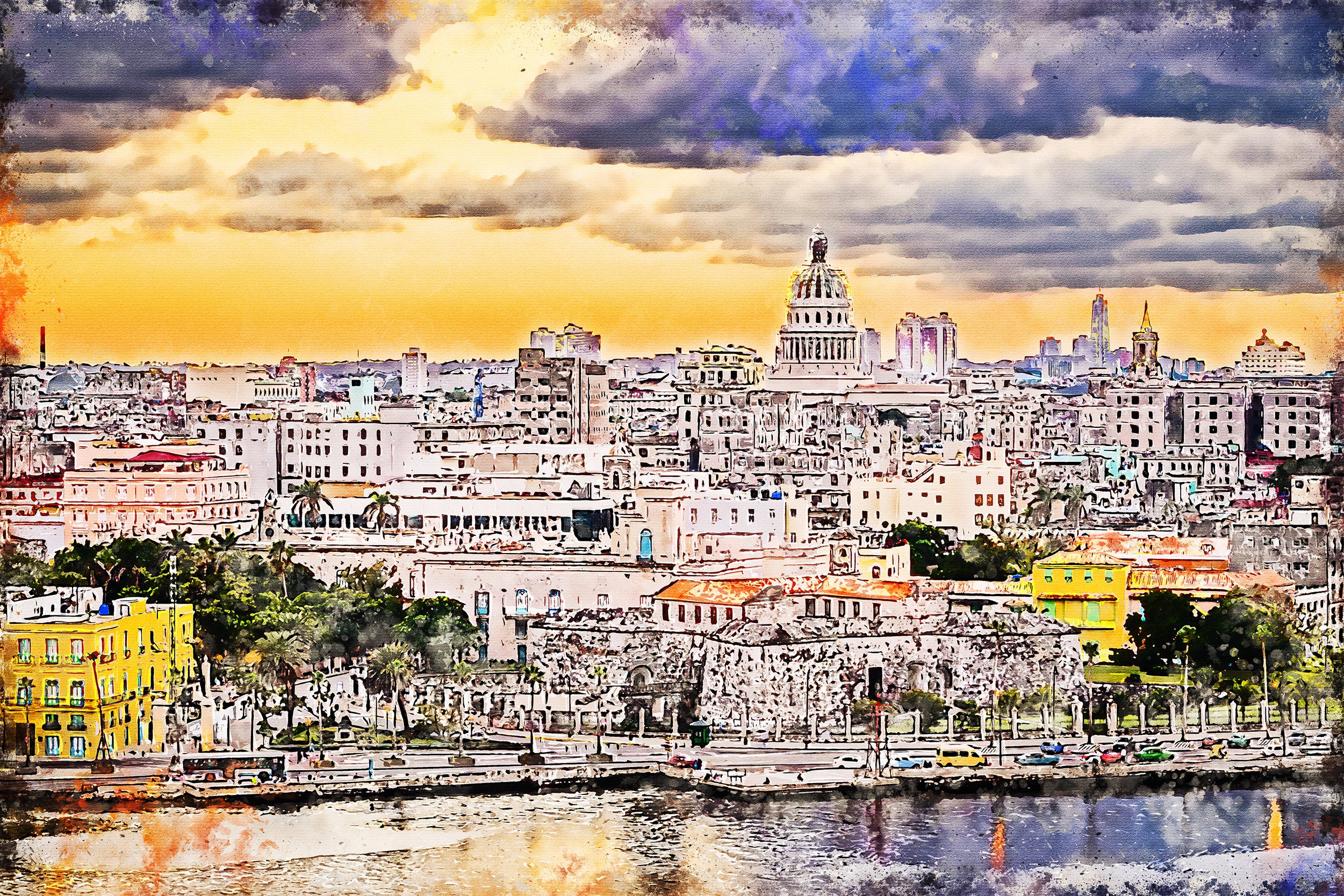 Havana Cuba skyline watercolor, Havana Cuba watercolor, Wall canvas, Havana Cuba Watercolor, Cuba art print, Cuba from the ocean