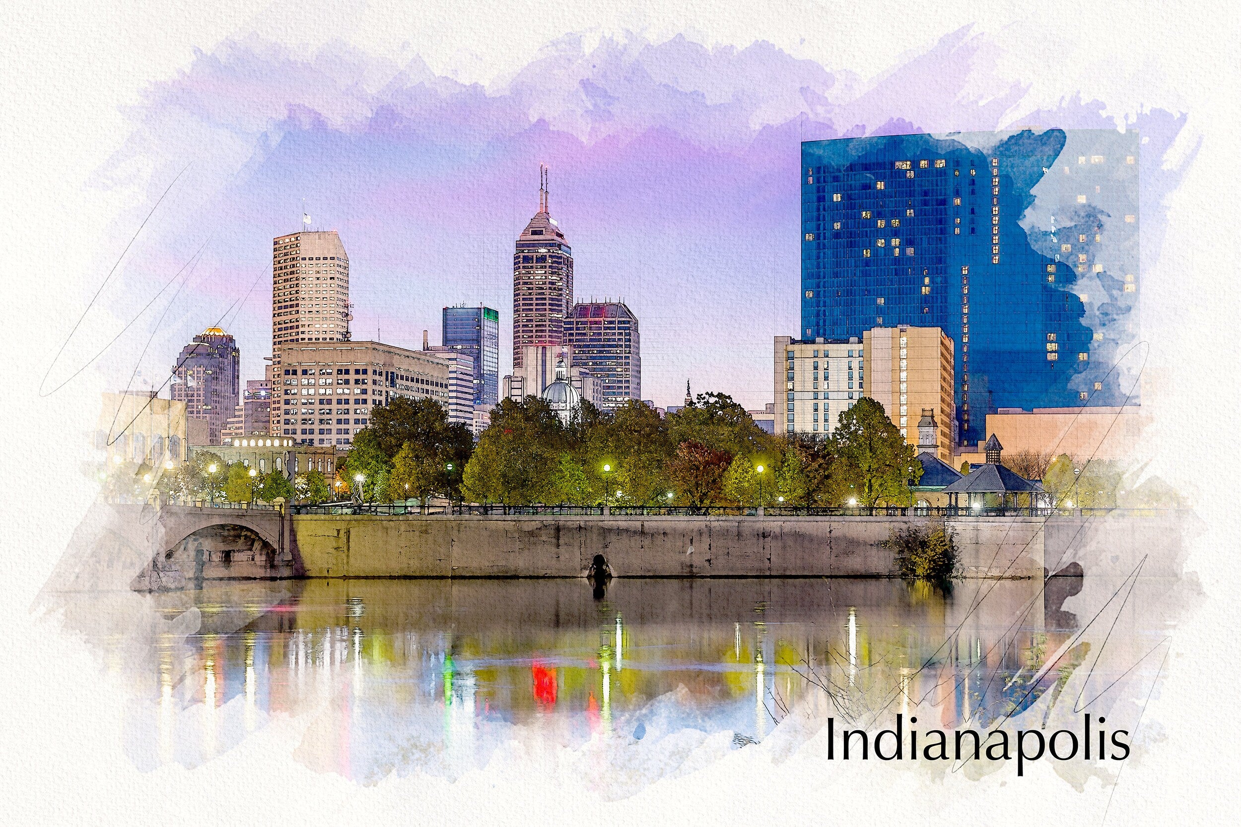 Stunning watercolor of the Indianapolis Indiana skyline. Indianapolis watercolor on canvas Great for a piece of wall art. Available as a single canvas at 16″ x 24″ , 24″ x 36″ , or 32″ x 48″ or we can make you a special 3 panel work of art.