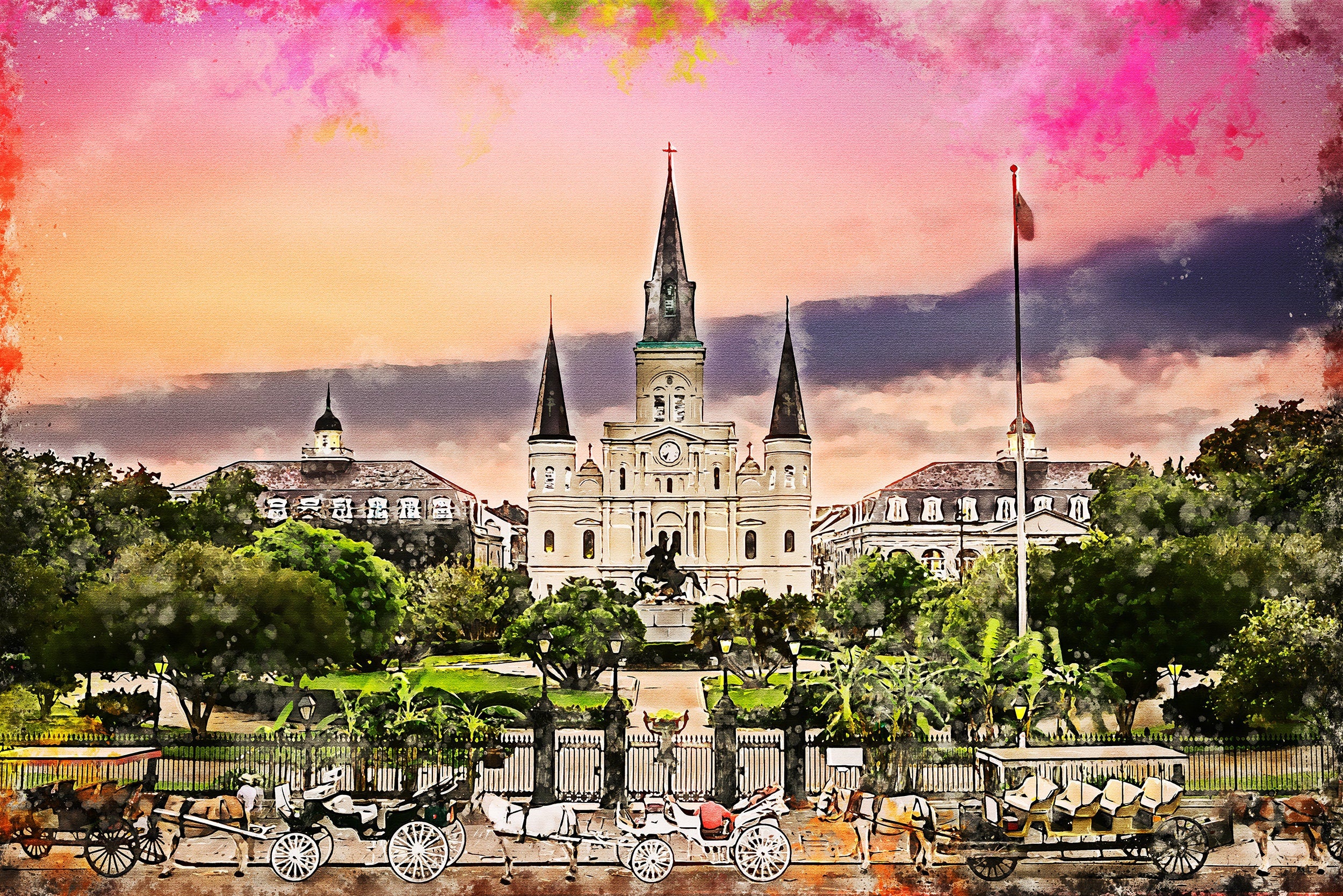 Jackson Square New Orleans watercolor canvas, New Orleans Canvas Print, New Orleans wall art, Canvas Wall Art, Watercolor Skyline,