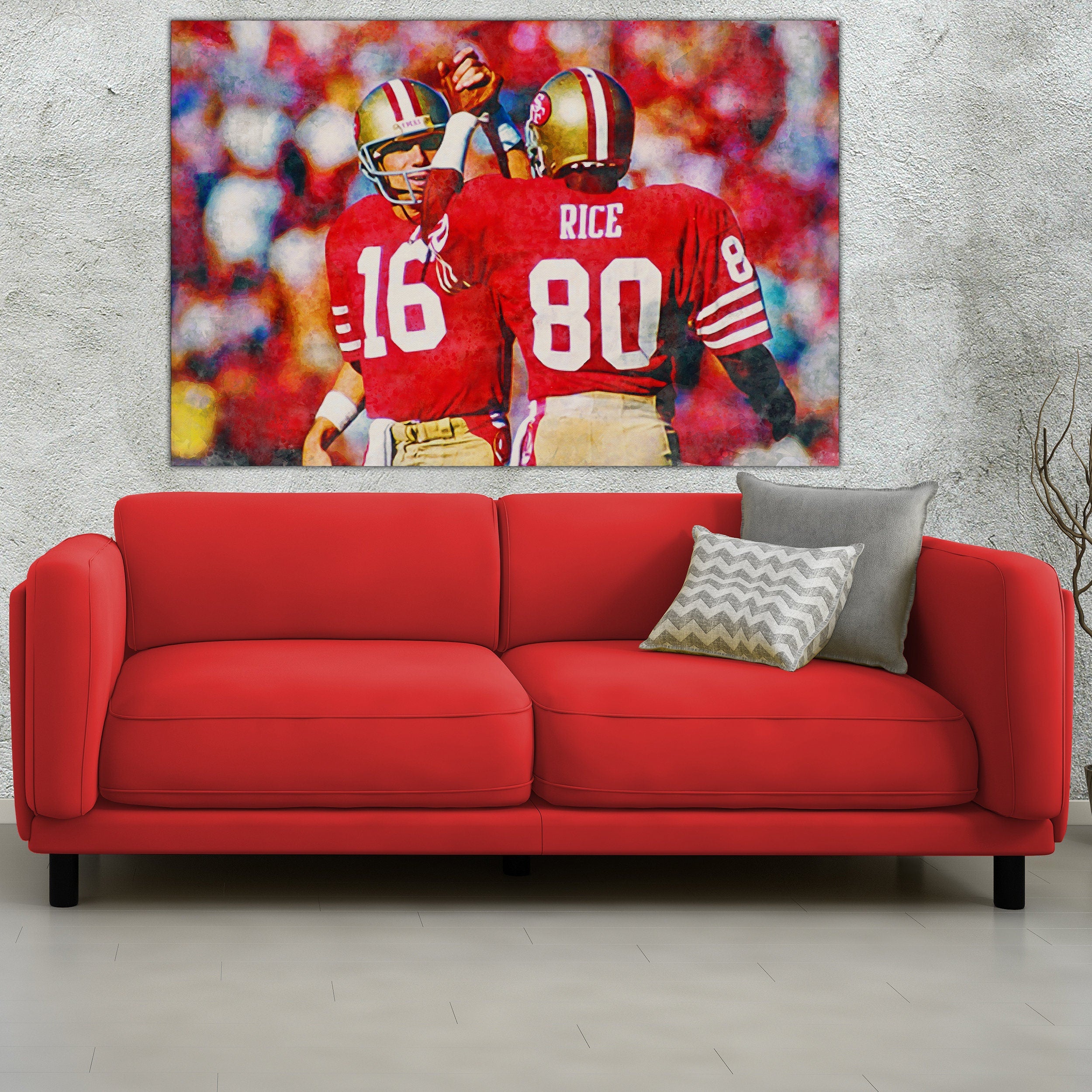 This watercolor is the perfect decor for any home. This print of my digitally custom created wall art will last a lifetime. Jerry Rice , Joe Montana poster