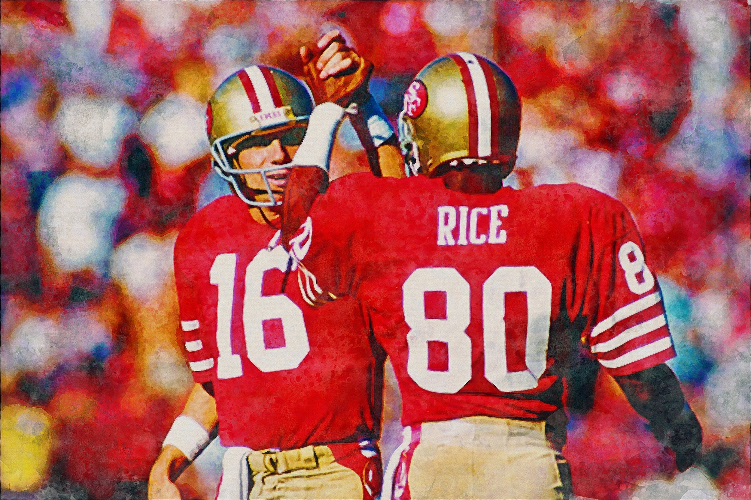 Beautiful watercolor of Jerry Rice and Joe Montana playing for the San Francisco 49ers