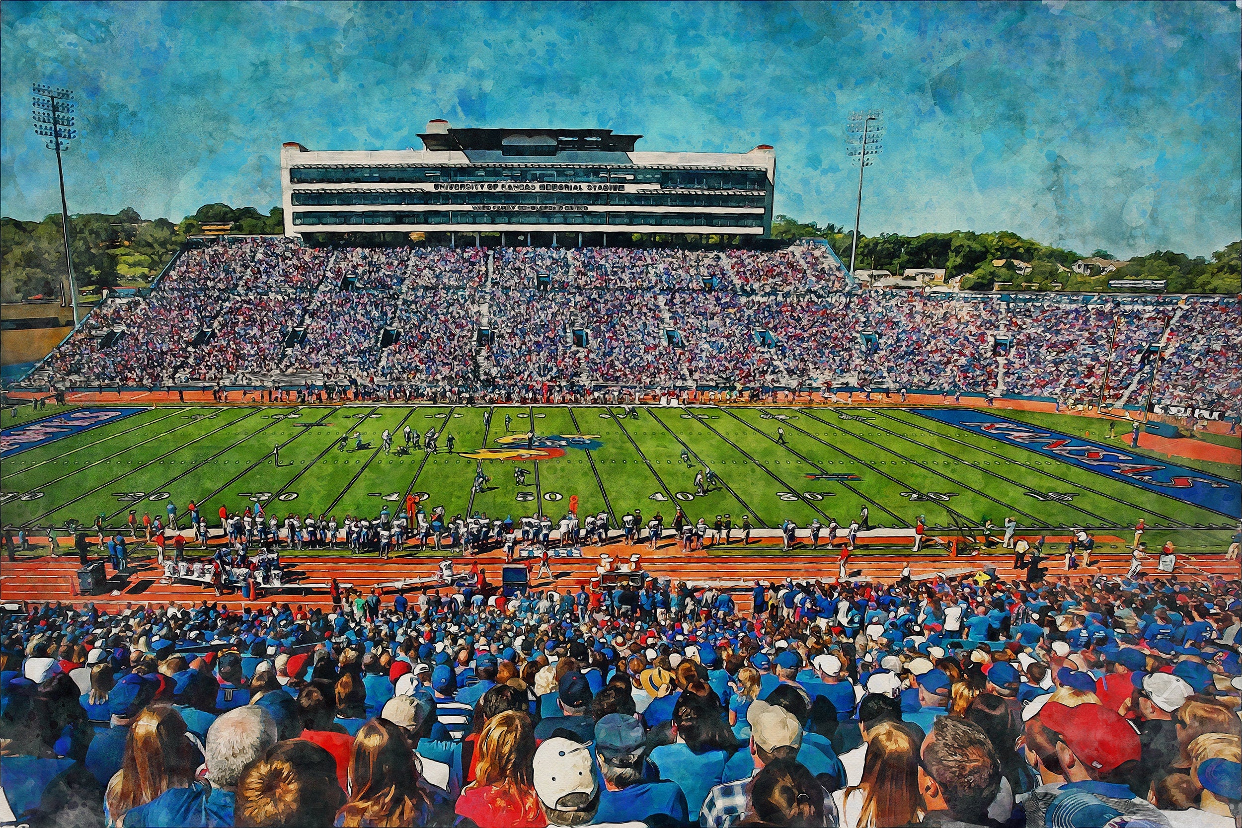 Beautiful Digital watercolor of David Booth Kansas Memorial Stadium in Lawrence Kansas