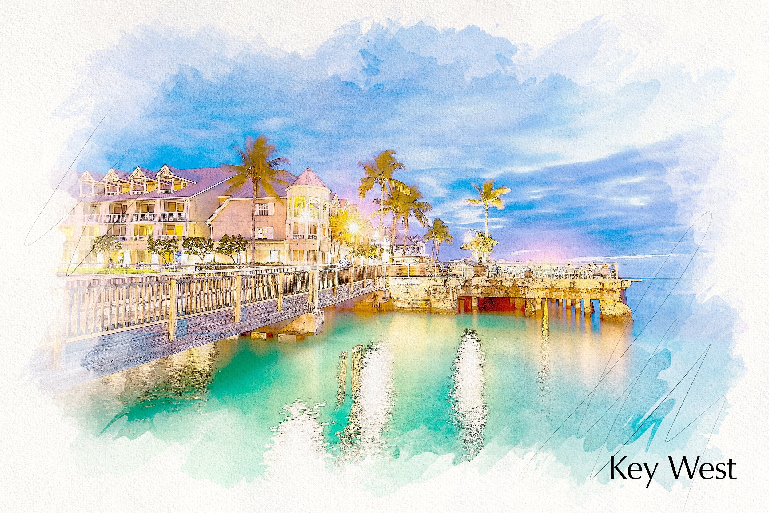 Key West Florida. Great colors! Available as a SINGLE canvas at 16″ x 24″ , 24″ x 36″ , or 32″ x 48″ or we can make you a special 3 panel work of art. Key West watercolor