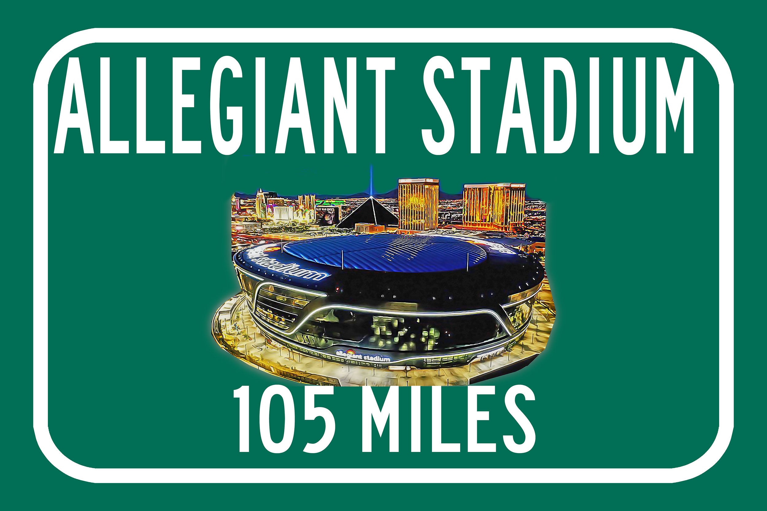 Personalized Highway Distance sign to Allegiant Stadium in Las Vegas. Custom replica road sign, with a watercolor photo of the stadium made with real distance from you to Allegiant Stadium. WE GO HUGE!! Not some itty-bitty sign, Our signs are as large as 2 x 3 FEET! Allegiant Stadium highway sign. Las Vegas Raider sign